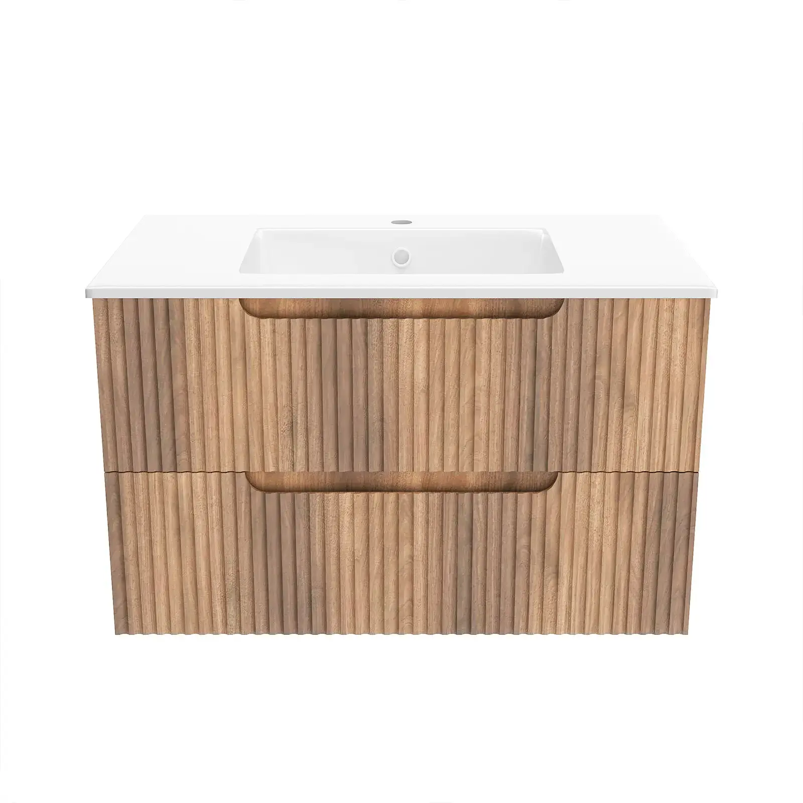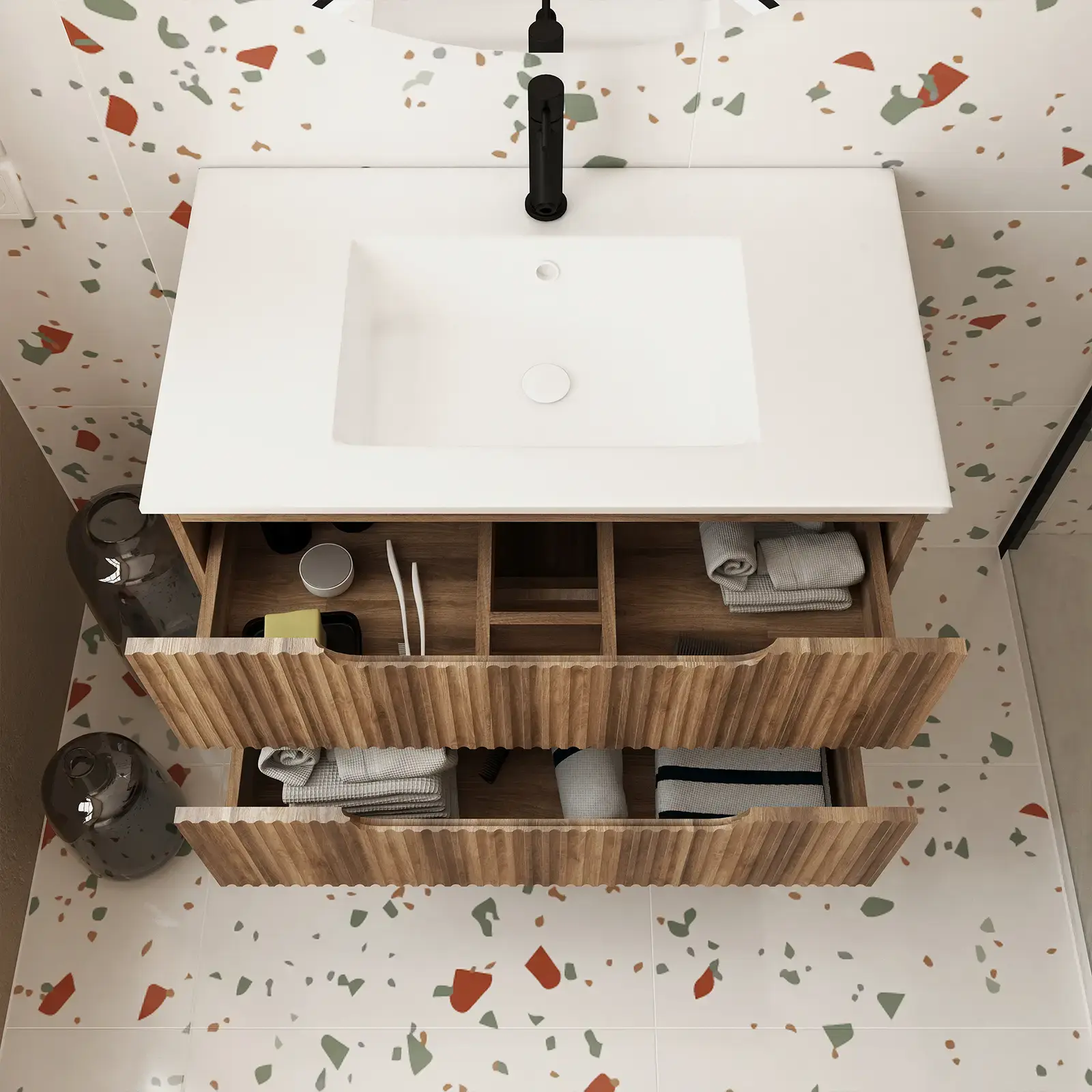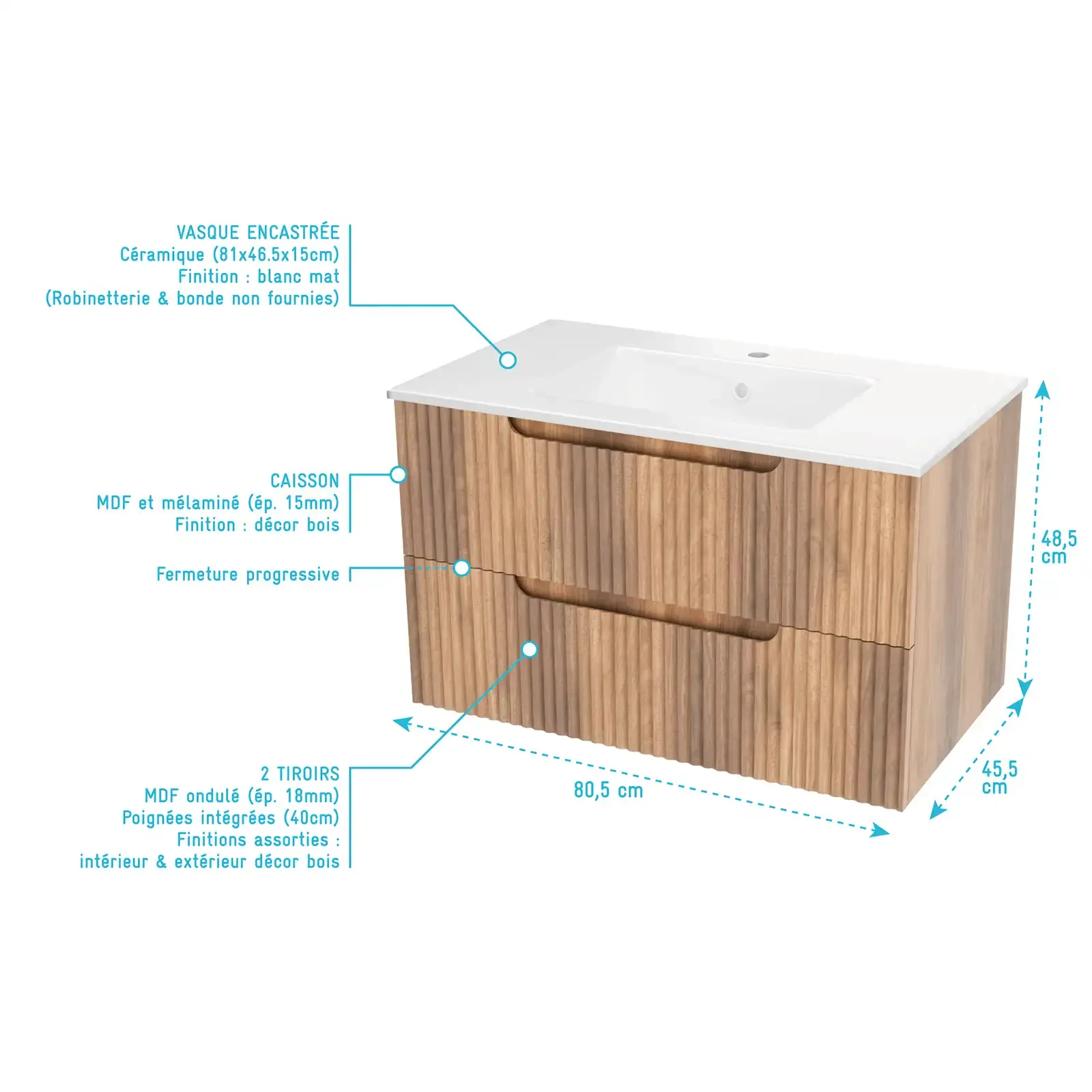 Meuble de Salle de Bains LEON 80cm Décor Bois – 2 Tiroirs en MDF Ondulés – Vasque à encastrer