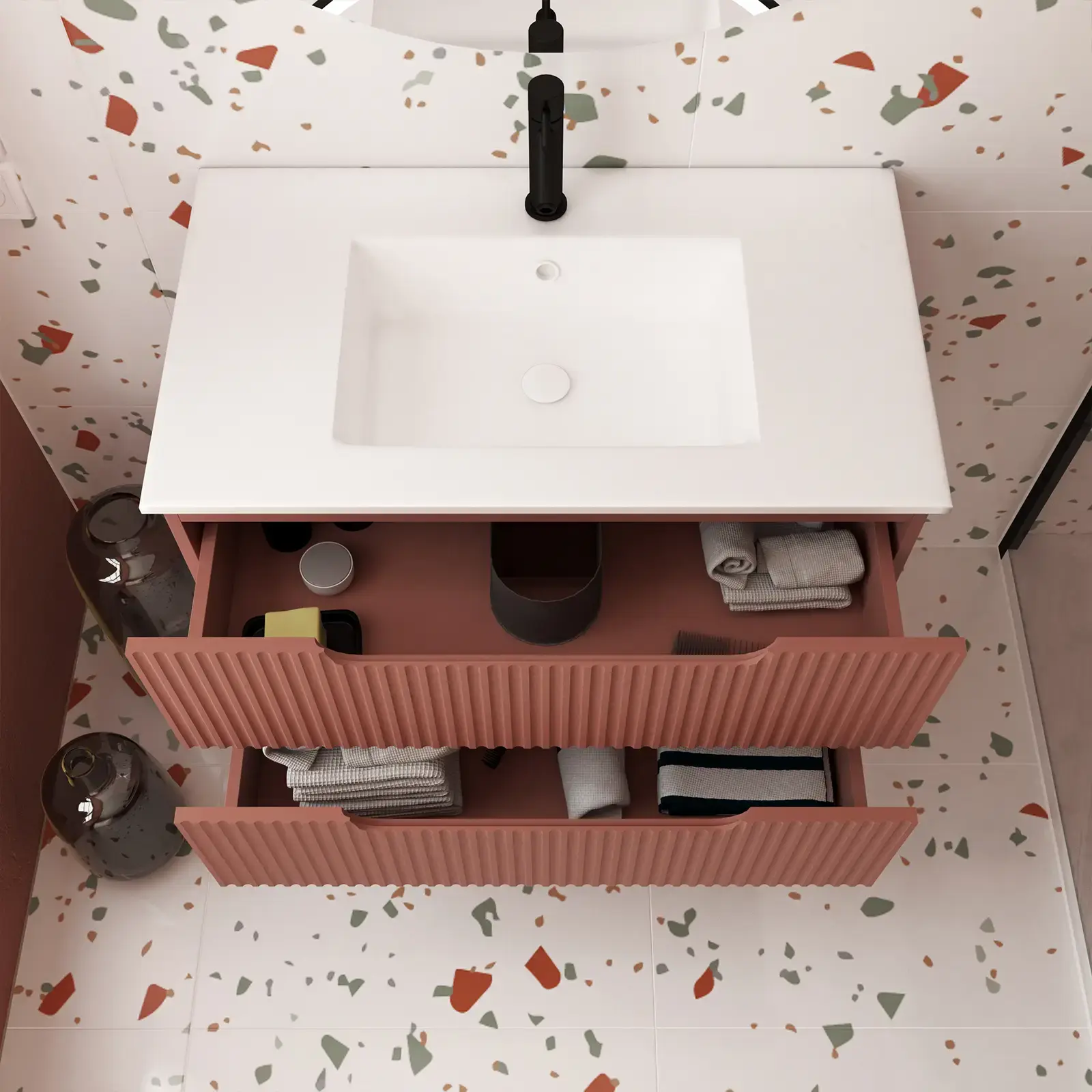 Les tiroirs ondulés incarnent l’esprit déco contemporain, offrant une esthétique dynamique et originale qui ne manquera pas de faire sensation dans votre salle de bain.
