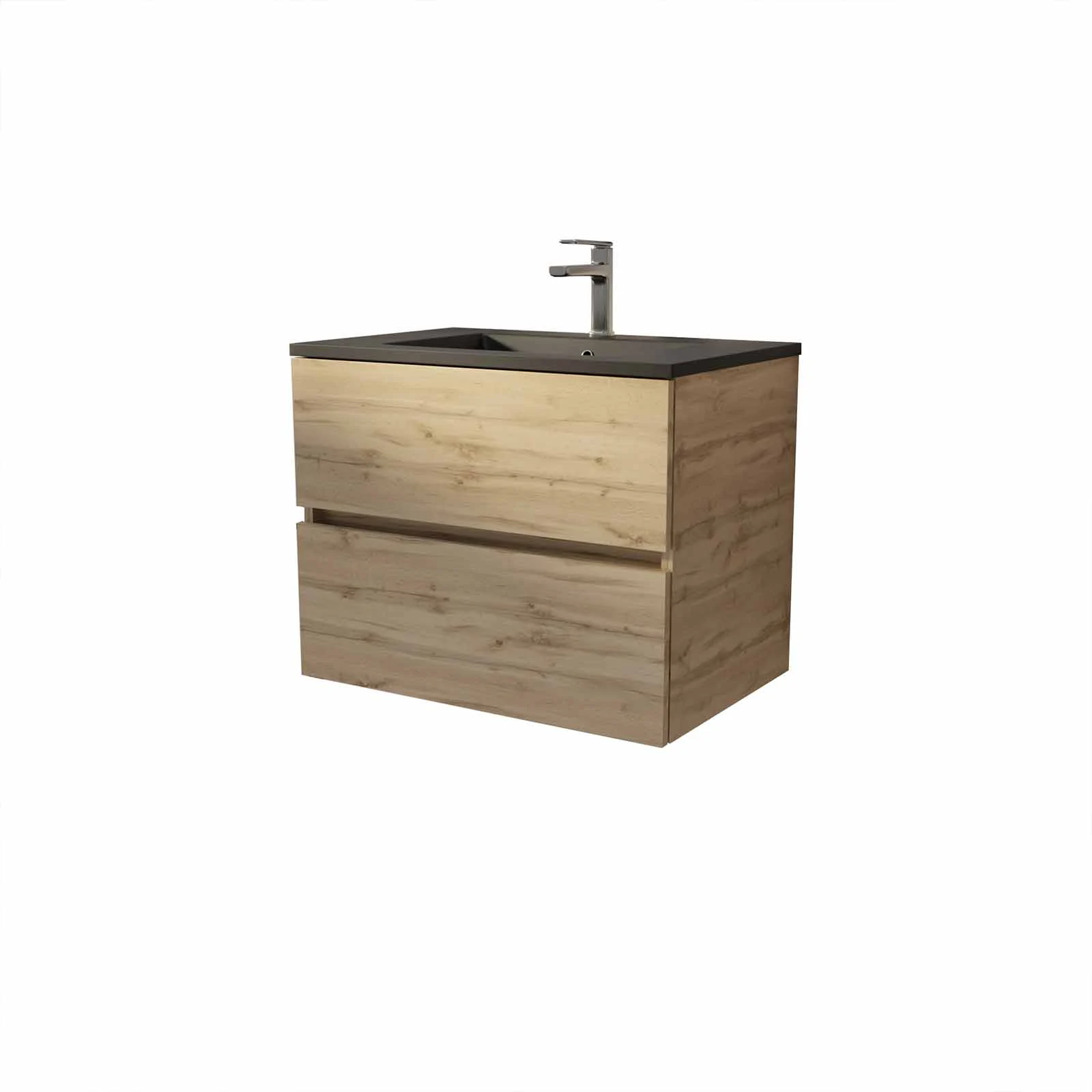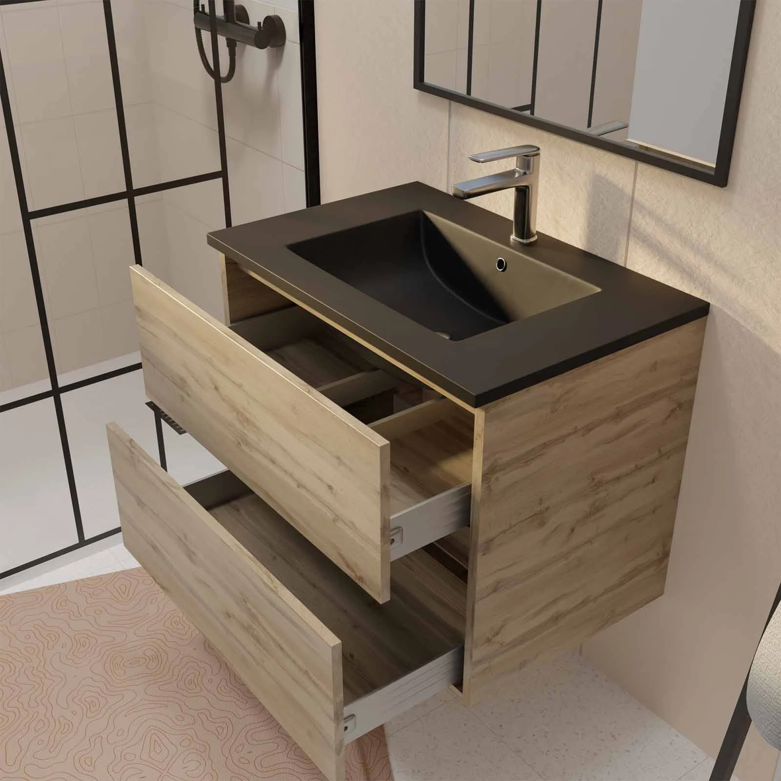 0 avis TIMBER Meuble de salle de bains suspendu 70 cm TIMBER - Décor Chêne Naturel 2 tiroirs avec Vasque noire