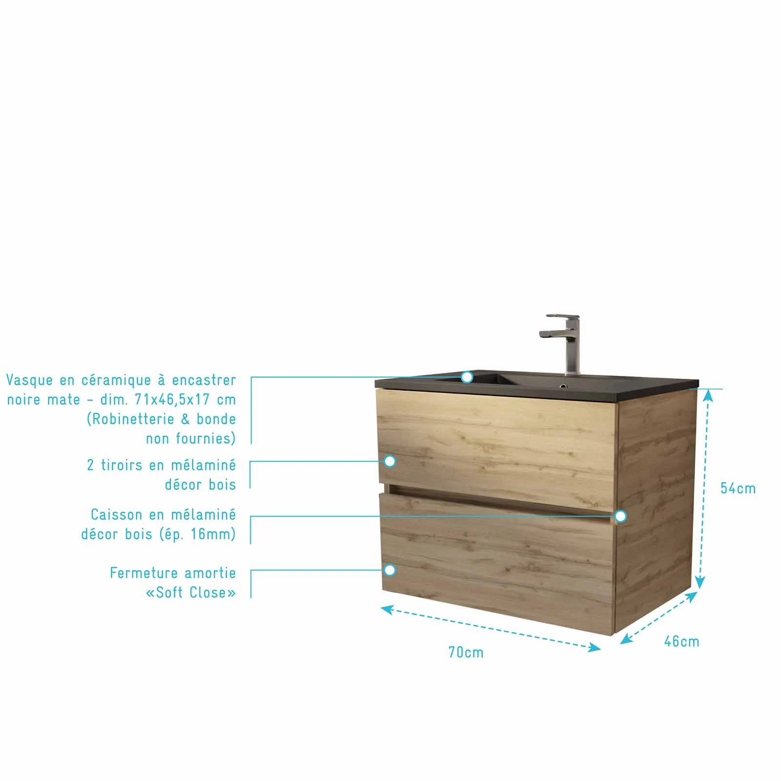 Meuble de salle de bains suspendu 70 cm TIMBER – Décor Chêne Naturel 2 tiroirs avec Vasque noire
