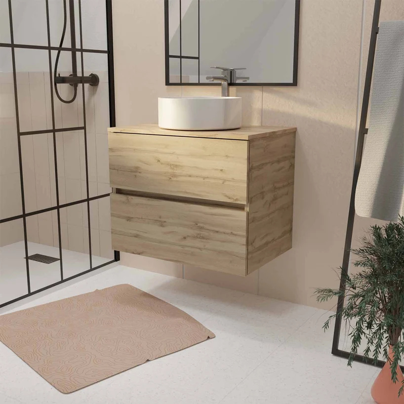 Meuble de salle de bains suspendu 70cm TIMBER Décor Chêne 2 tiroirs Vasque blanche à poser