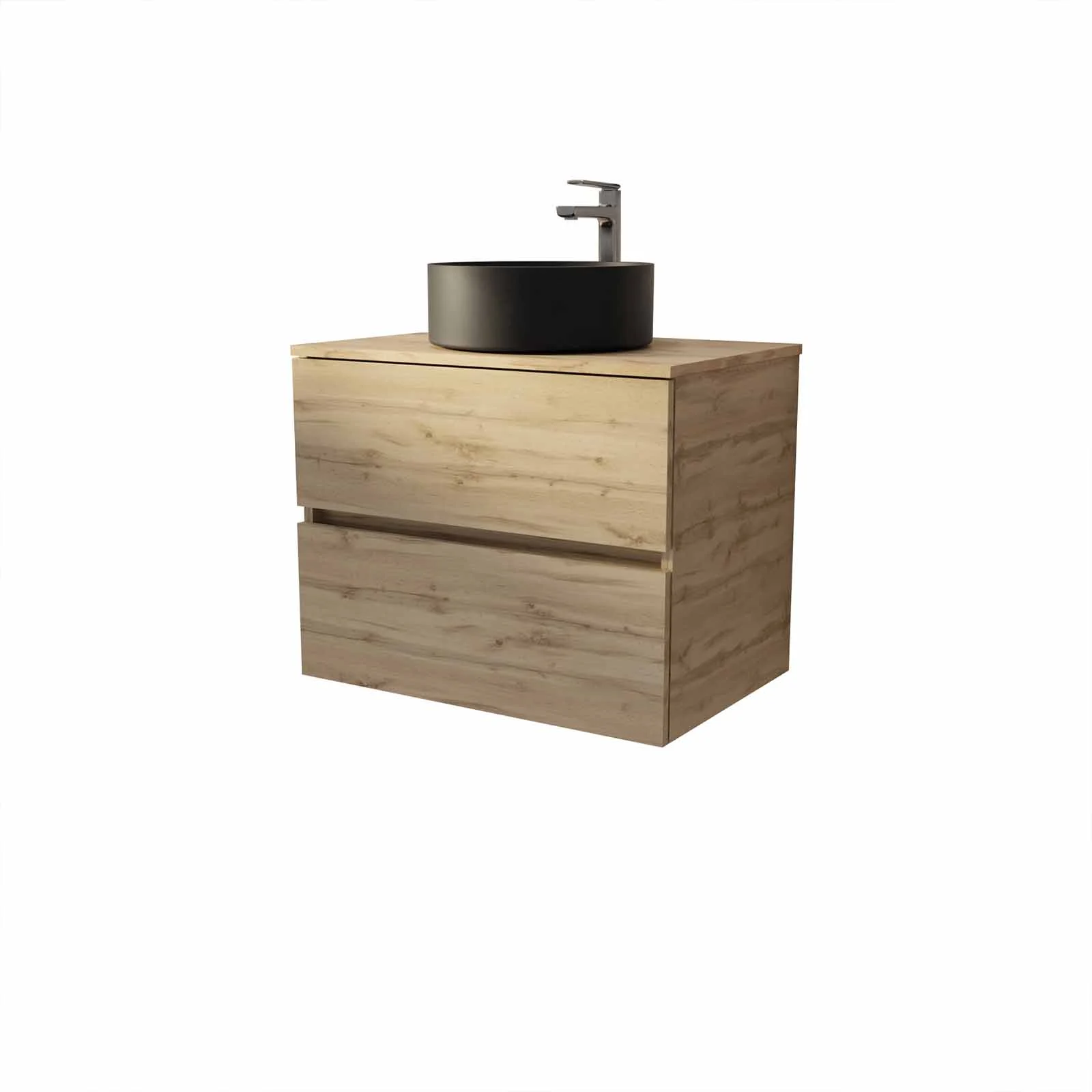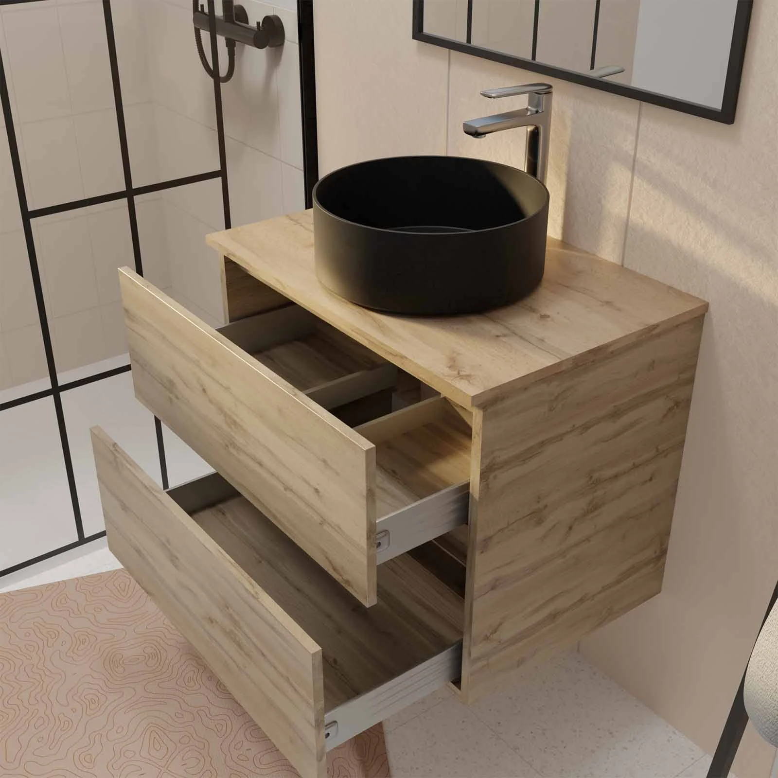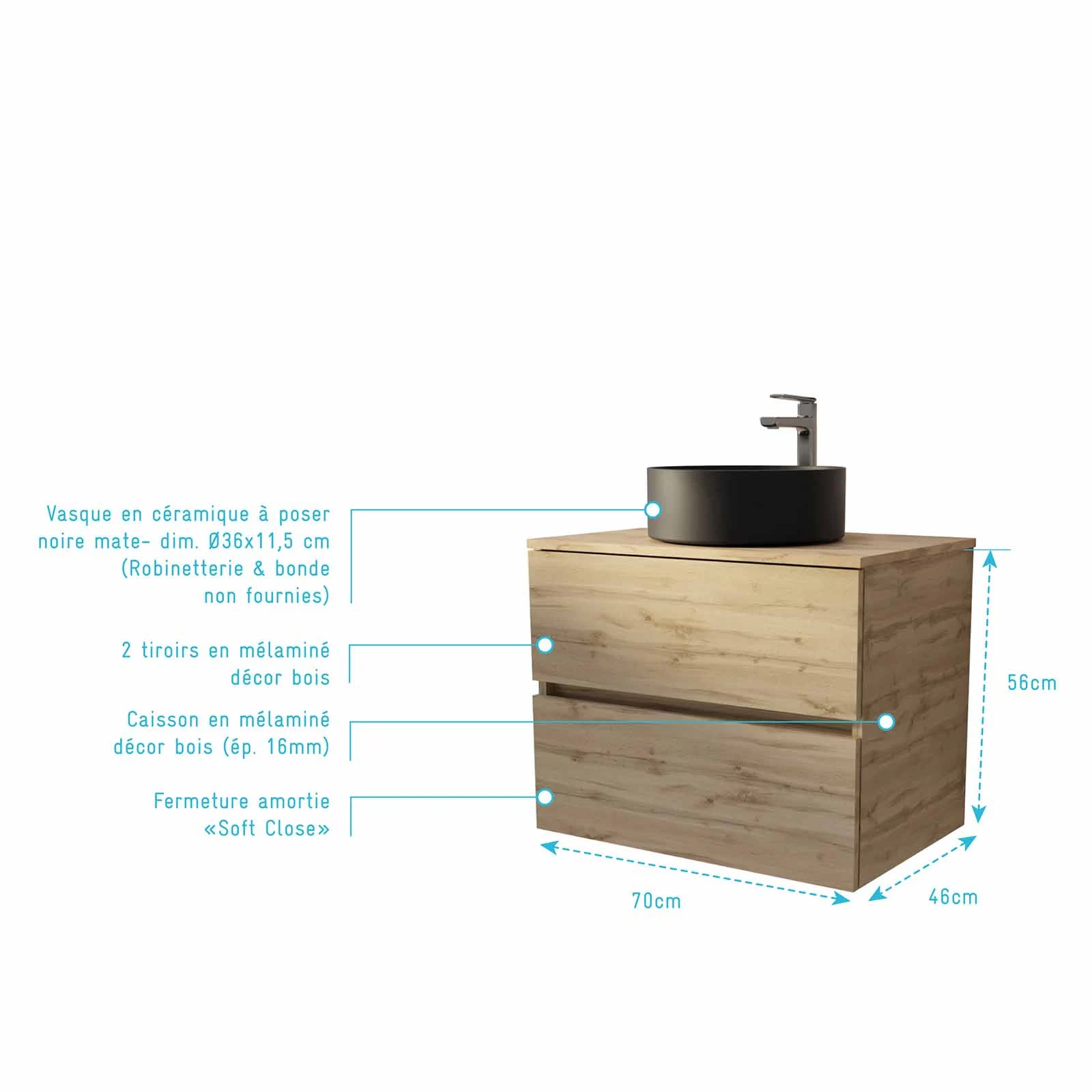Meuble de salle de bains suspendu 70cm TIMBER Décor Chêne 2 tiroirs Vasque noire à poser