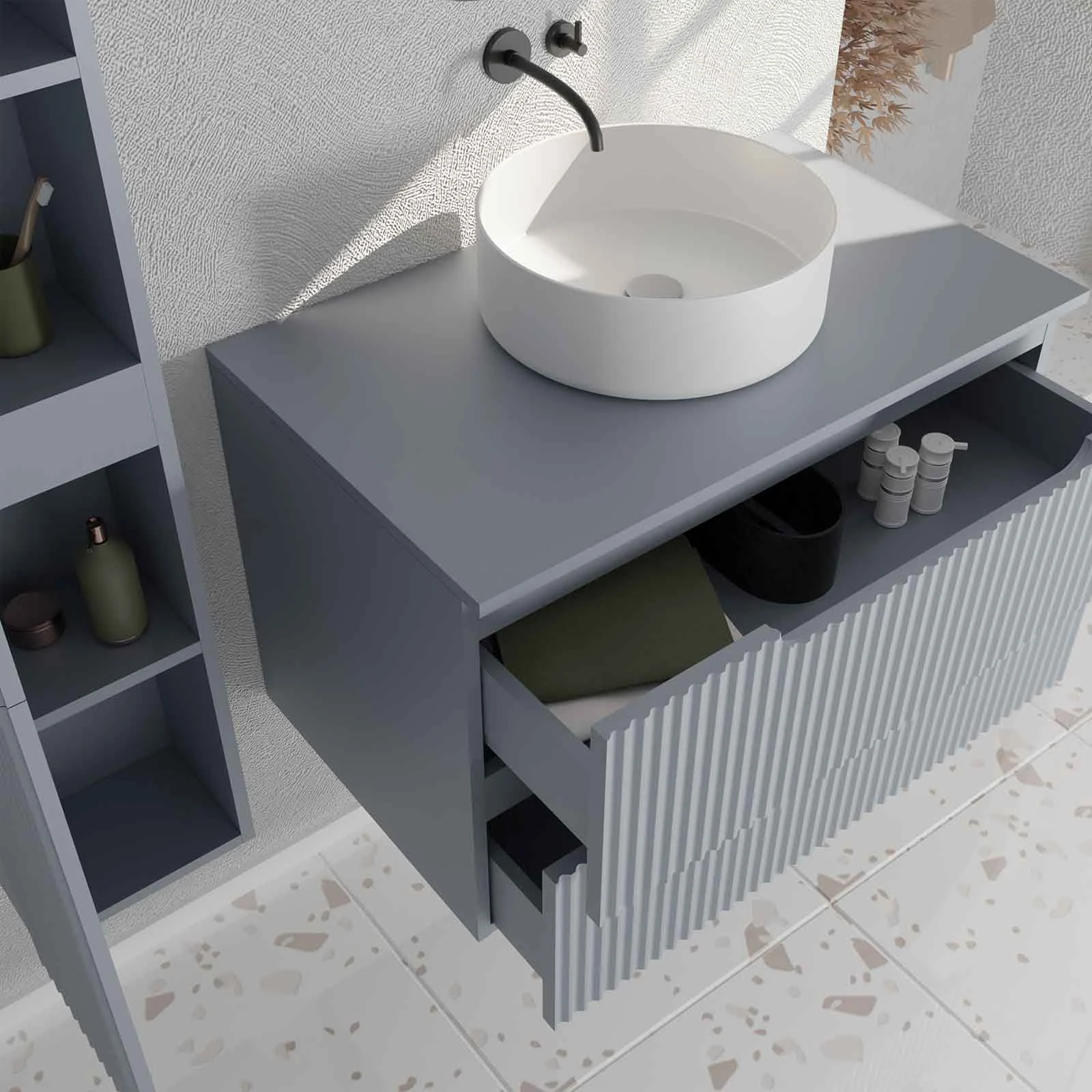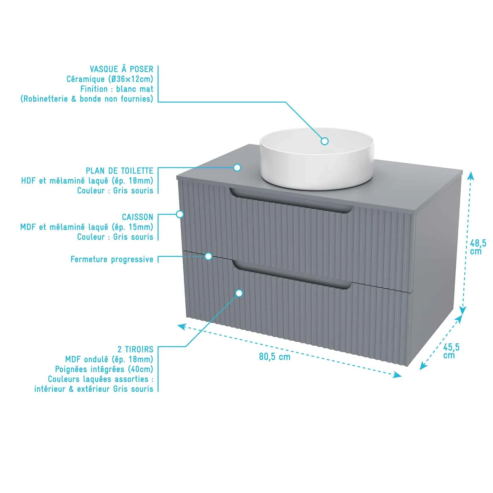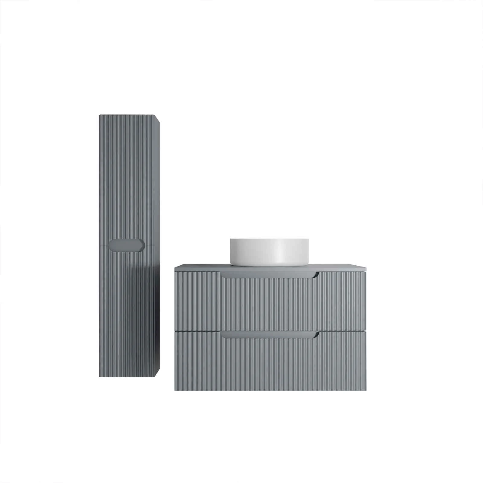 Meuble et colonne de Salle de Bains LEON 80cm Gris souris – Façades Ondulées – Vasque Ronde 36cm