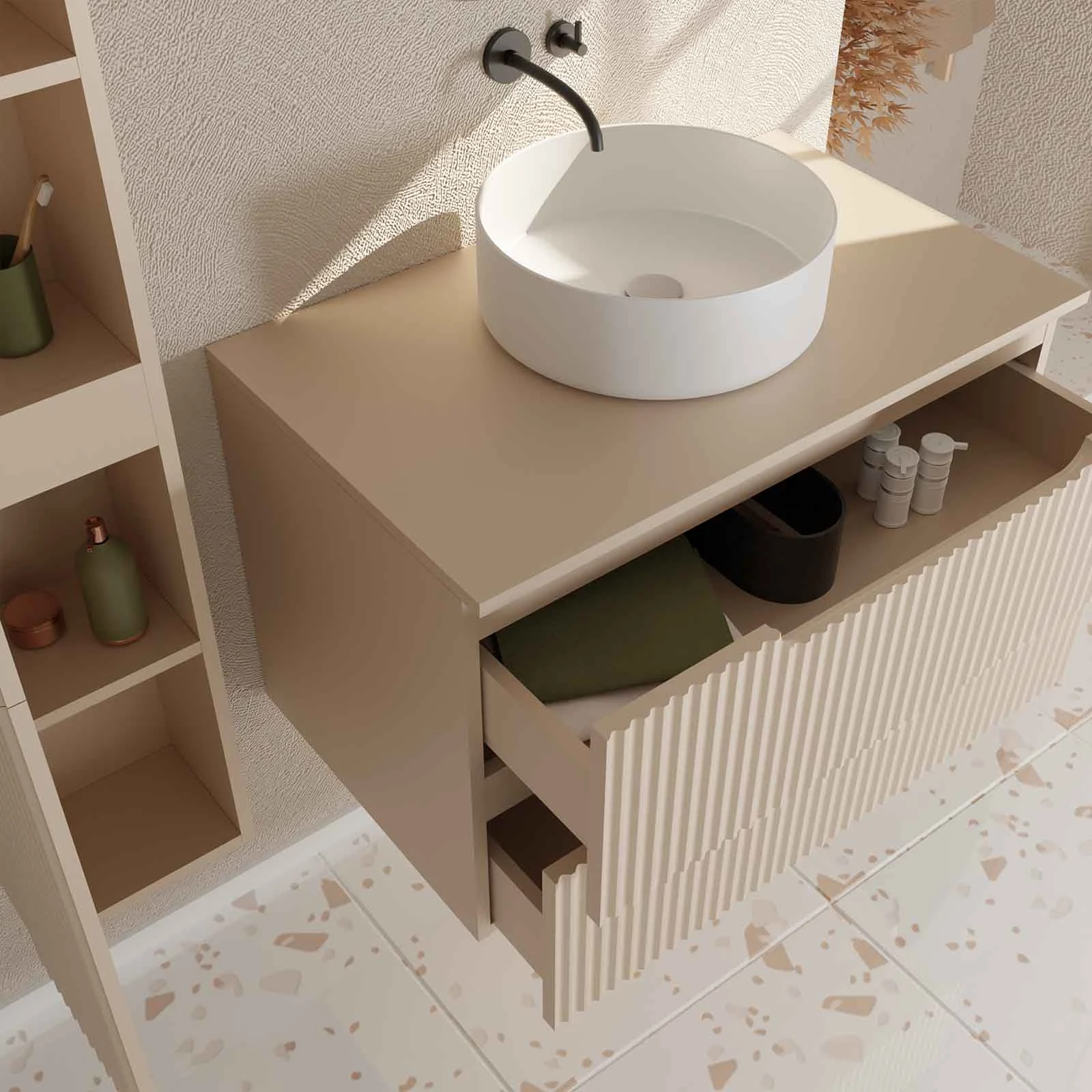 Optez pour un ensemble où la couleur et les formes s’harmonisent avec élégance, apportant relief, fonctionnalité et originalité à votre salle de bain !