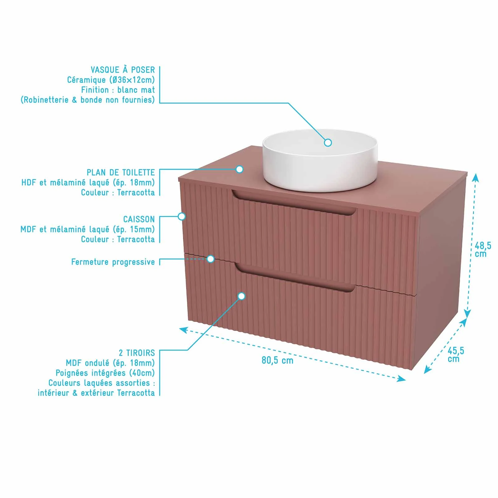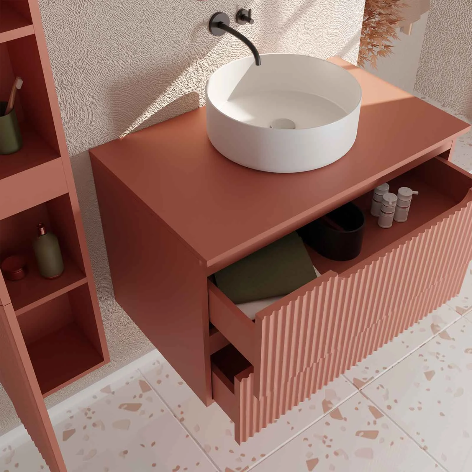 Meuble et colonne de Salle de Bains LEON 80cm Terracotta – Façades Ondulées – Vasque Ronde 36cm