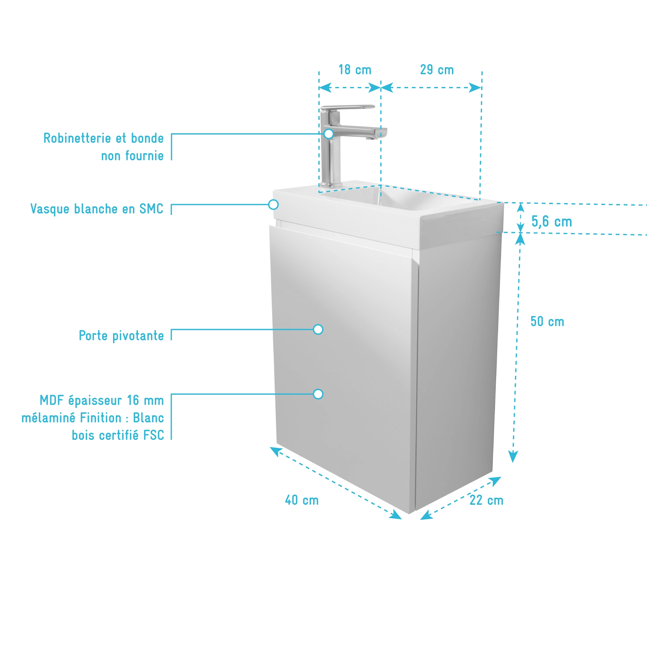 Meuble Lave Mains Blanc 40x50x22 cm avec Vasque en SMC - ELEMENTARY