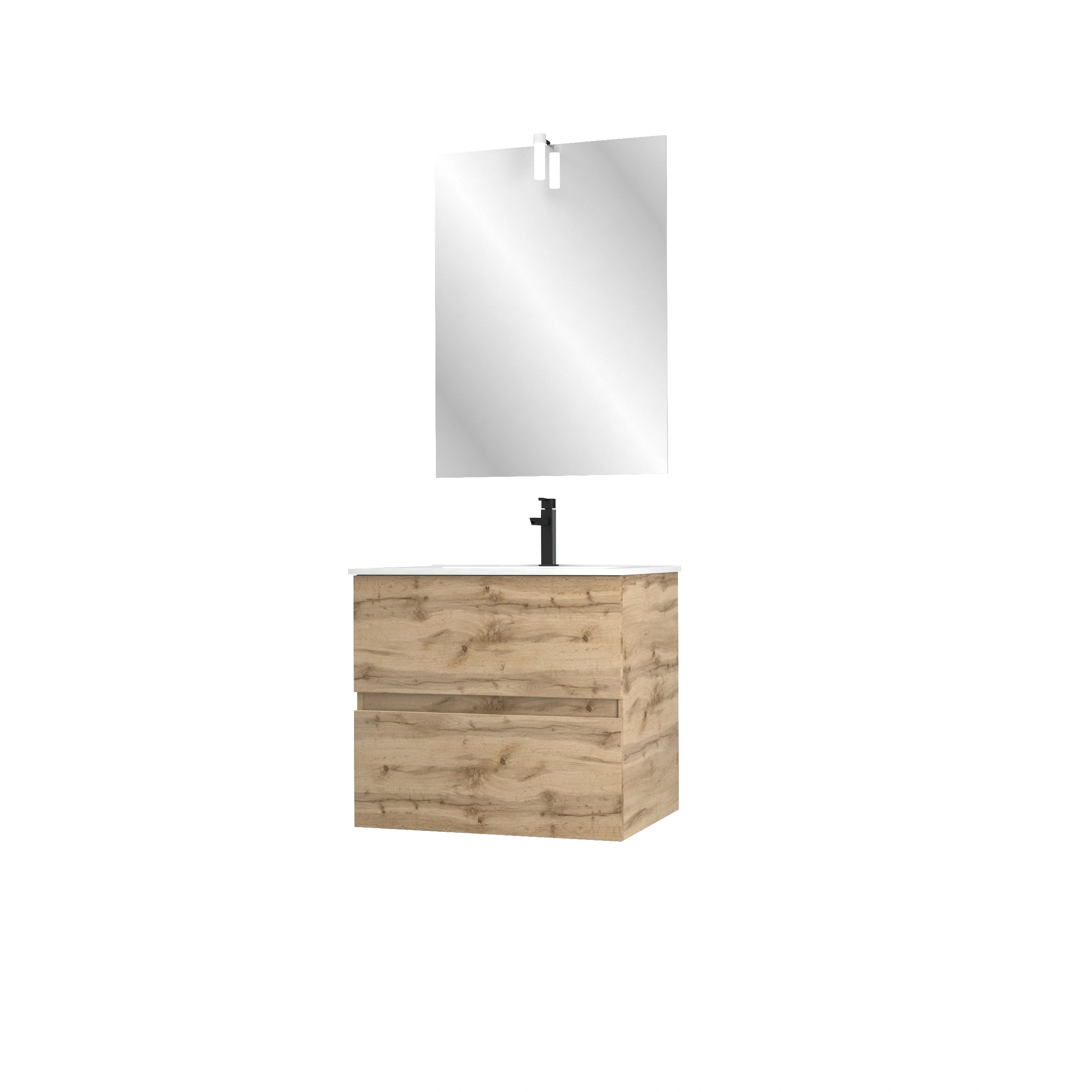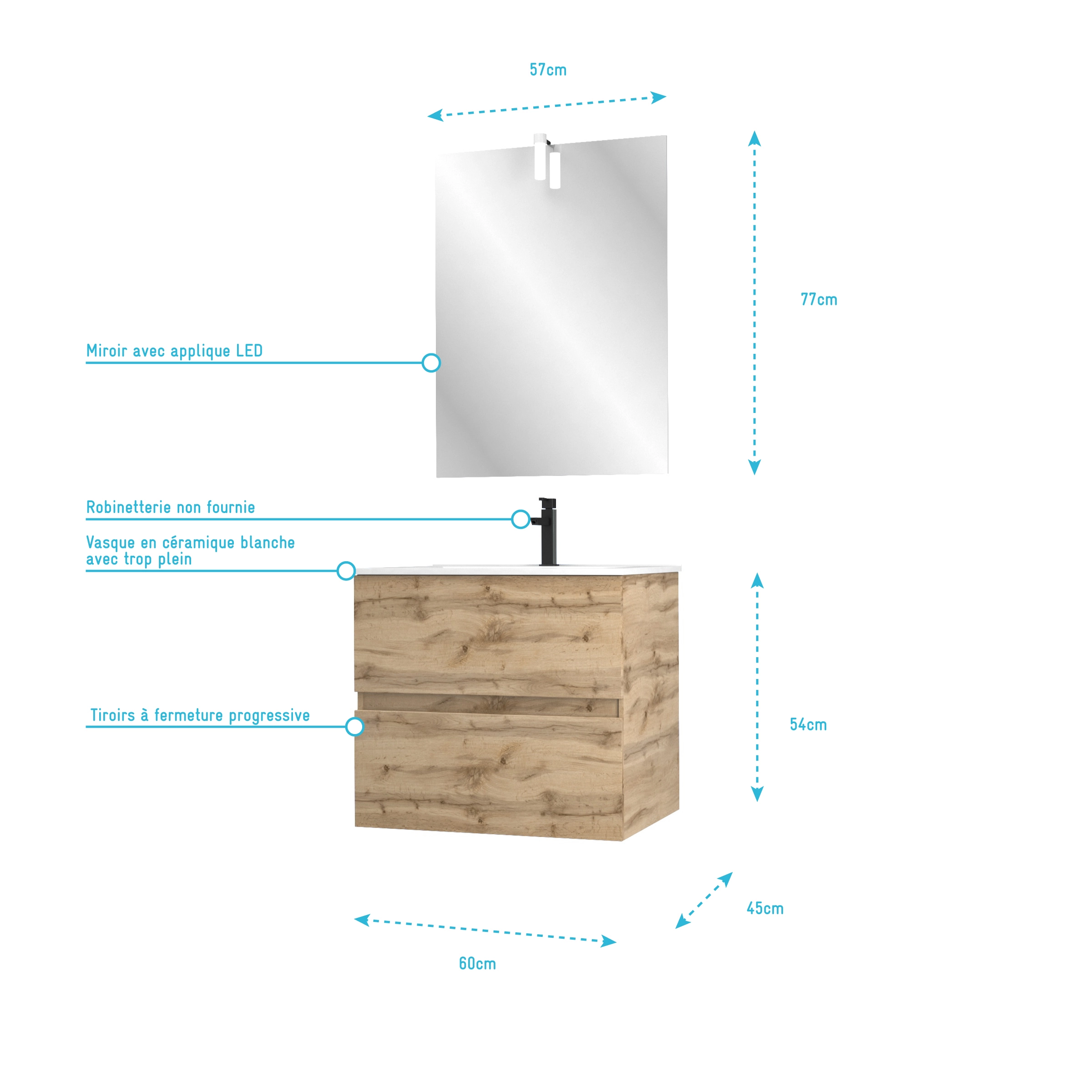Pack Meuble SDB 60cm suspendu 2 tiroirs Chene_Vasque blanche + Miroir Led – TIMBER 60_Pack31