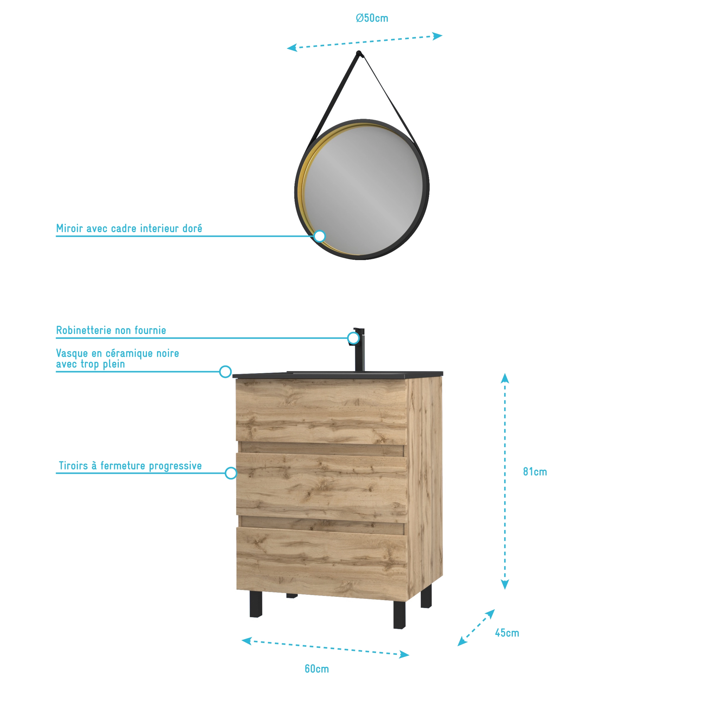 Pack Meuble SDB 60cm sur pieds 3 tiroirs Chene_Vasque noire + Miroir Barber – TIMBER 60 – Pack40