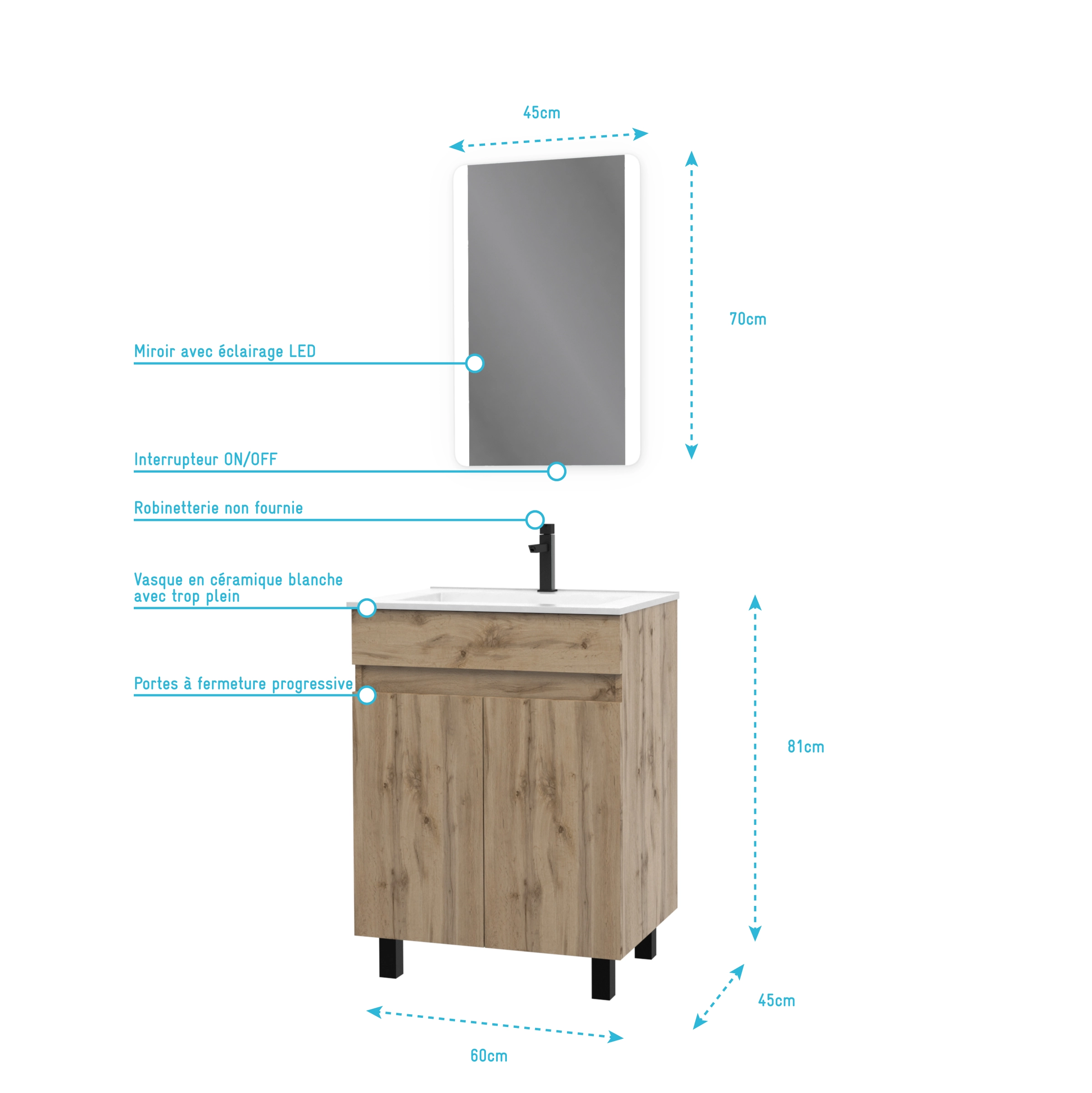 Meuble salle de bain 60×80 – Finition chene naturel – vasque blanche + miroir Led – TIMBER 60