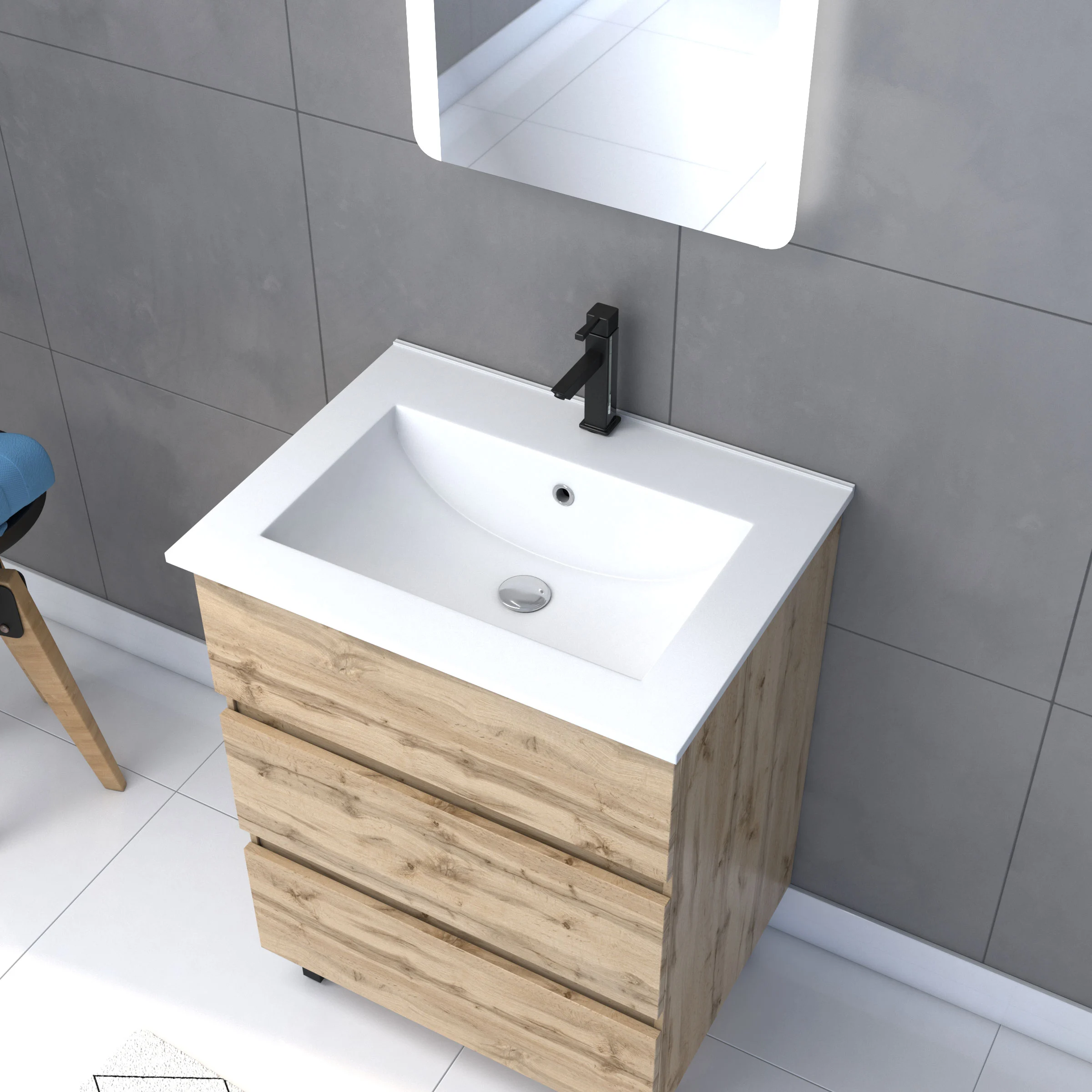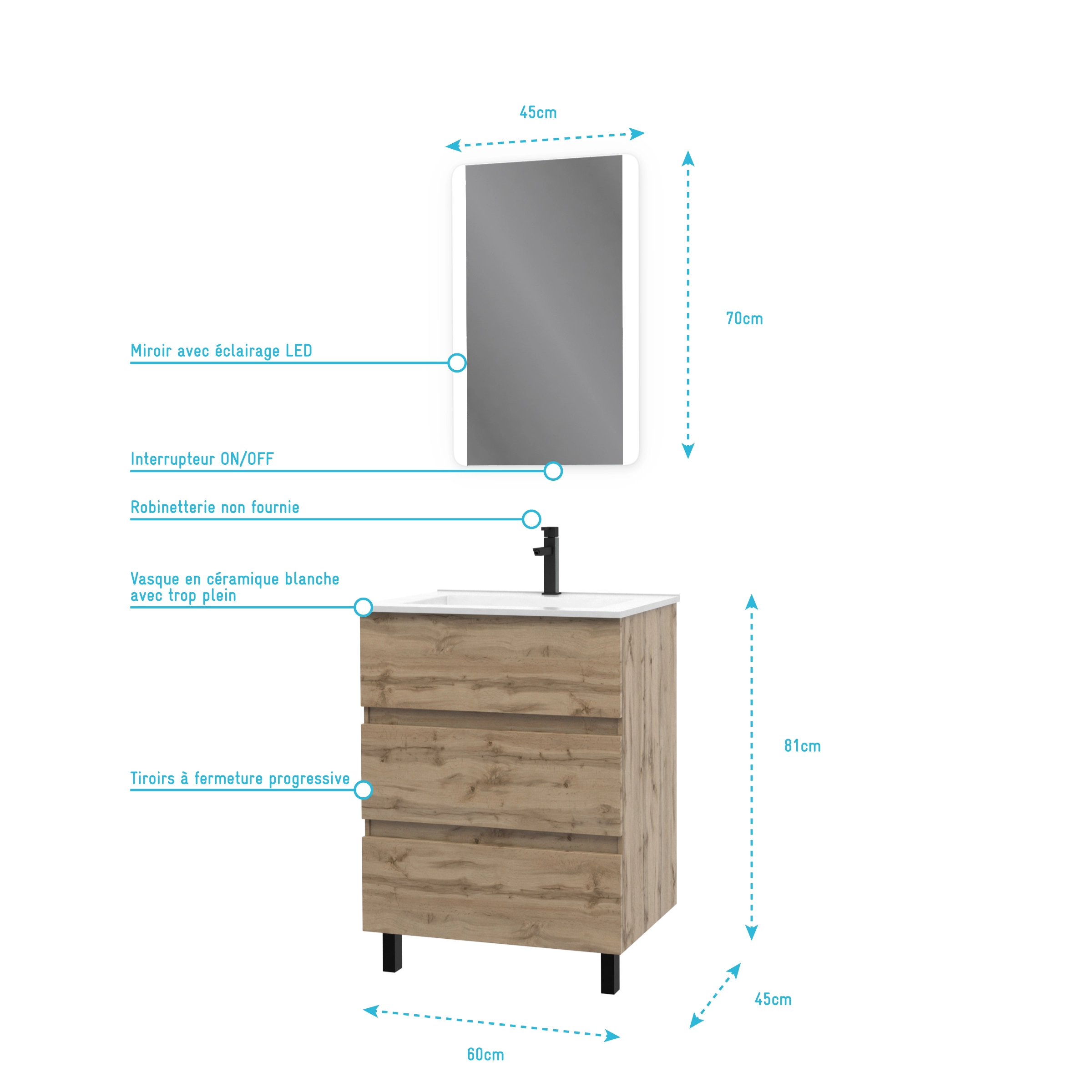 Pack Meuble SDB 60cm sur pieds 3 tiroirs Chene Naturel – Vasque blanche + Miroir Led – TIMBER 60