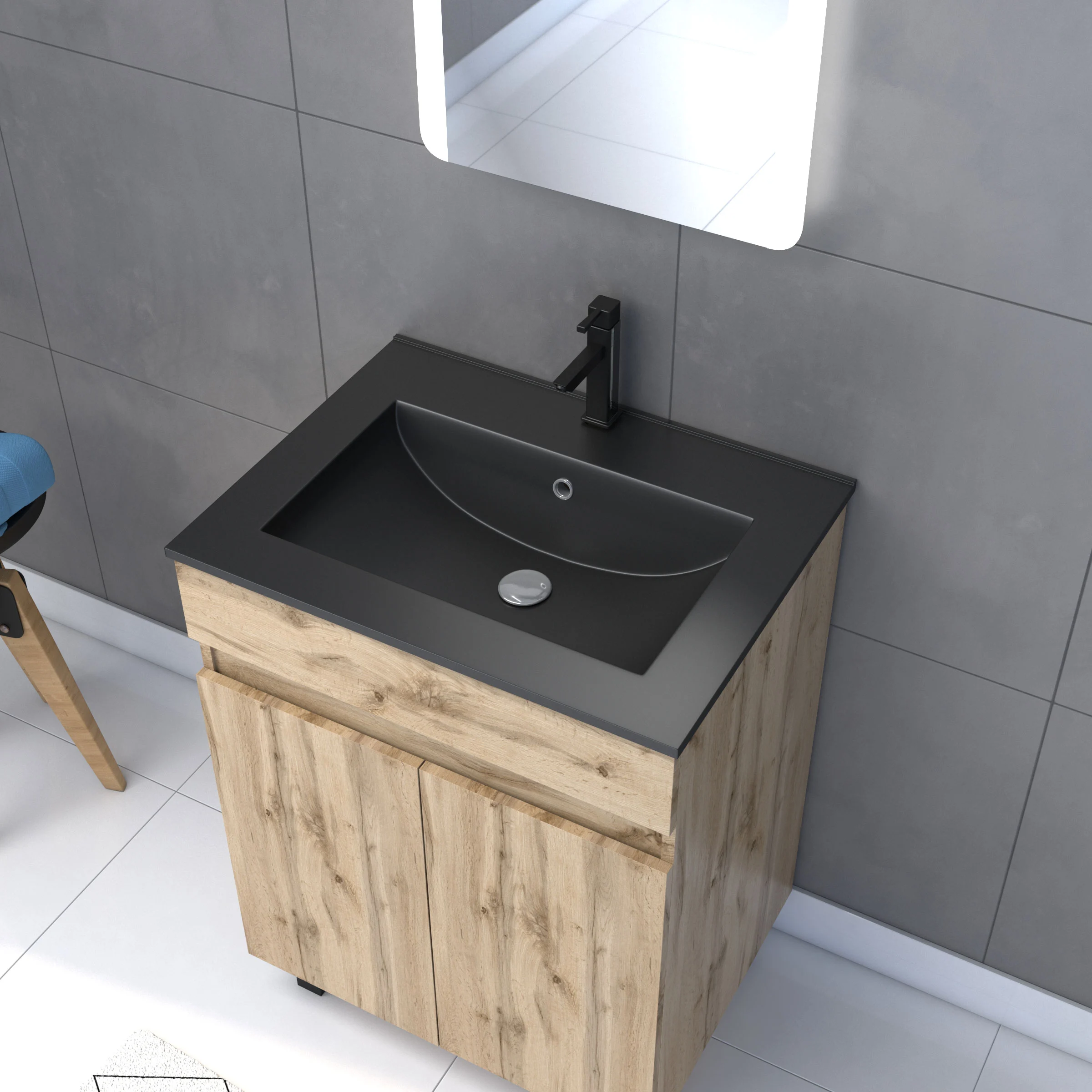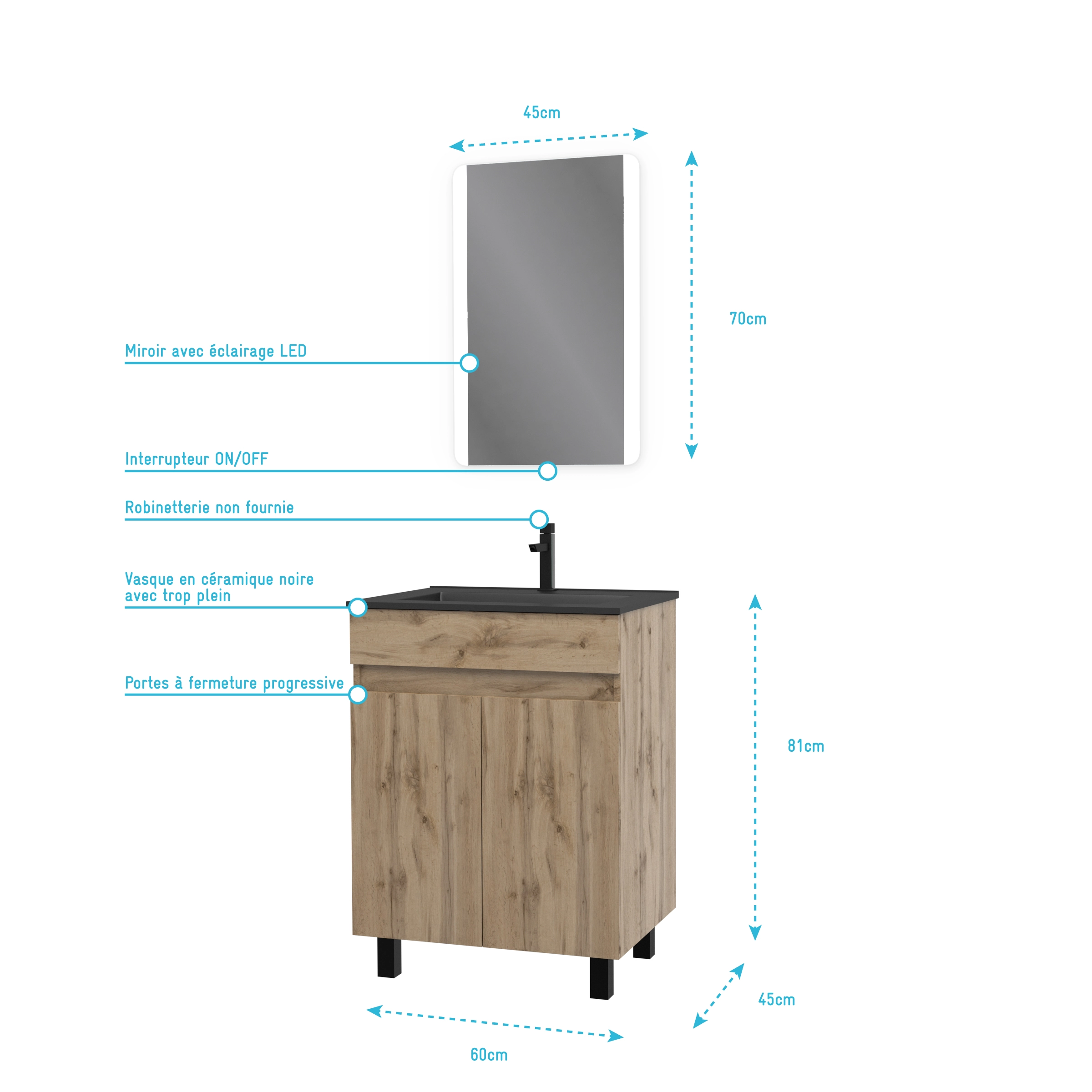 6 avis pour Meuble salle de bain 60×80 – Finition chene naturel – vasque noire + miroir Led – TIMBER 60 – Pack02