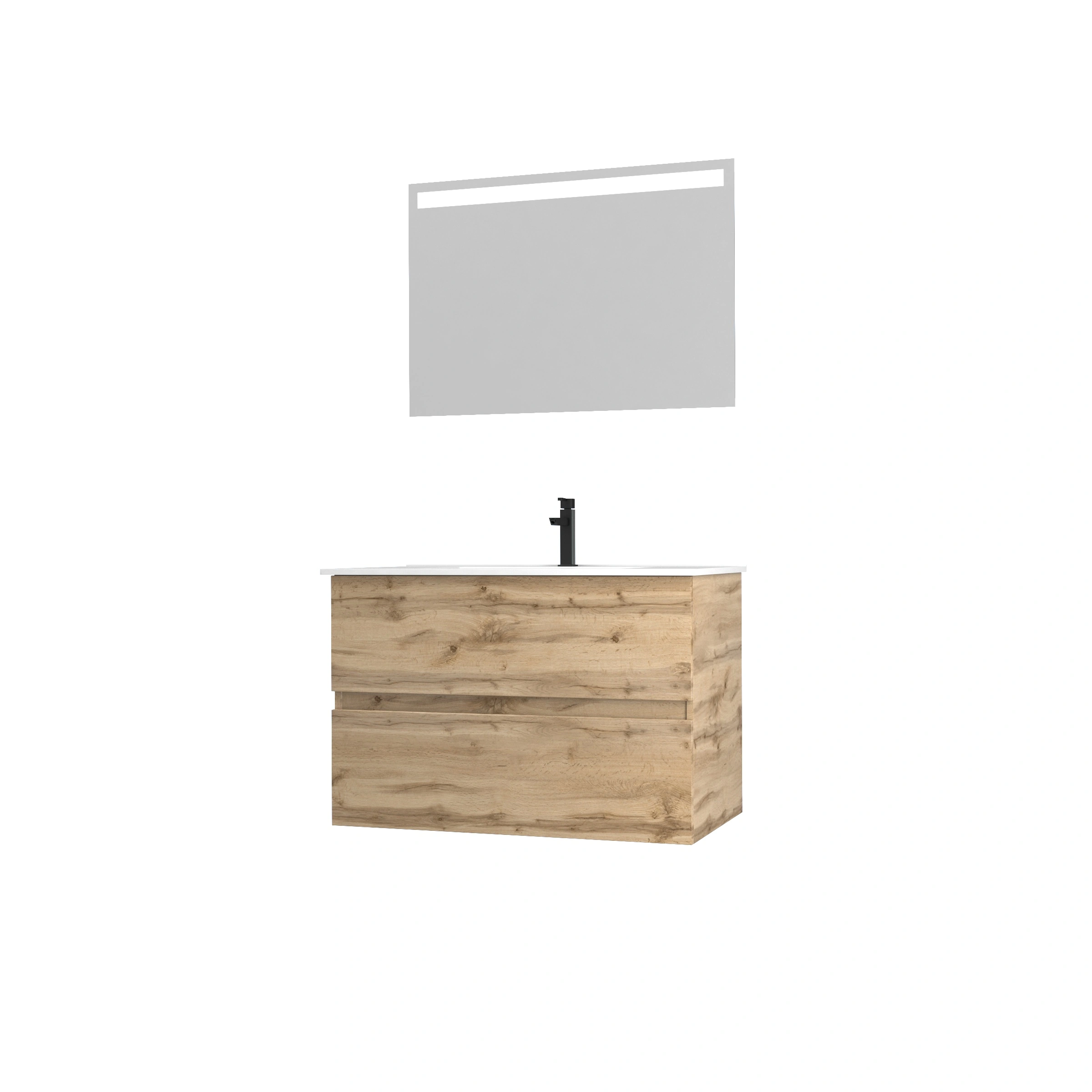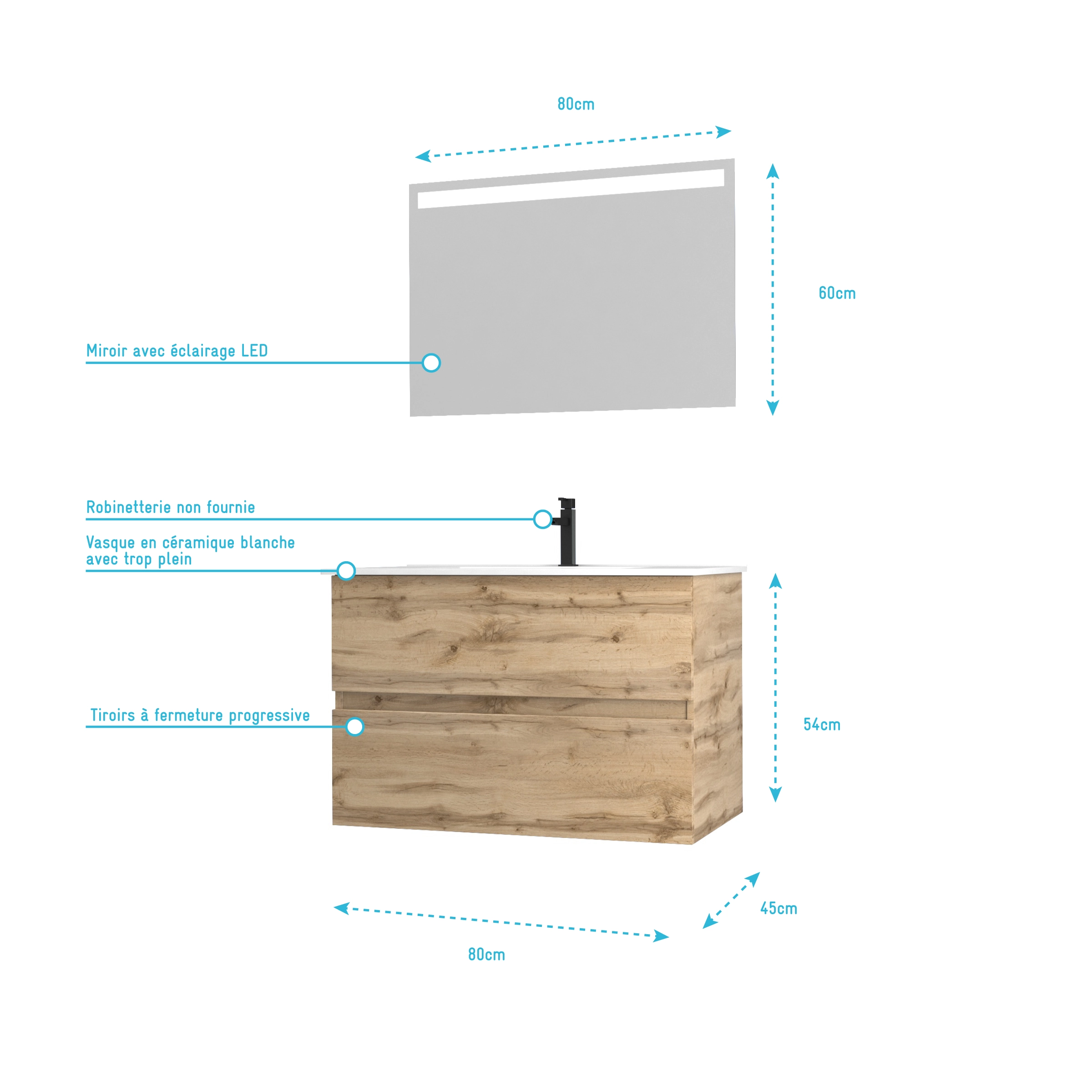 1 avis pour Pack Meuble SDB 80cm suspendu 2 tiroirs Chene_Vasque blanche + Miroir Led – TIMBER 80_Pack36