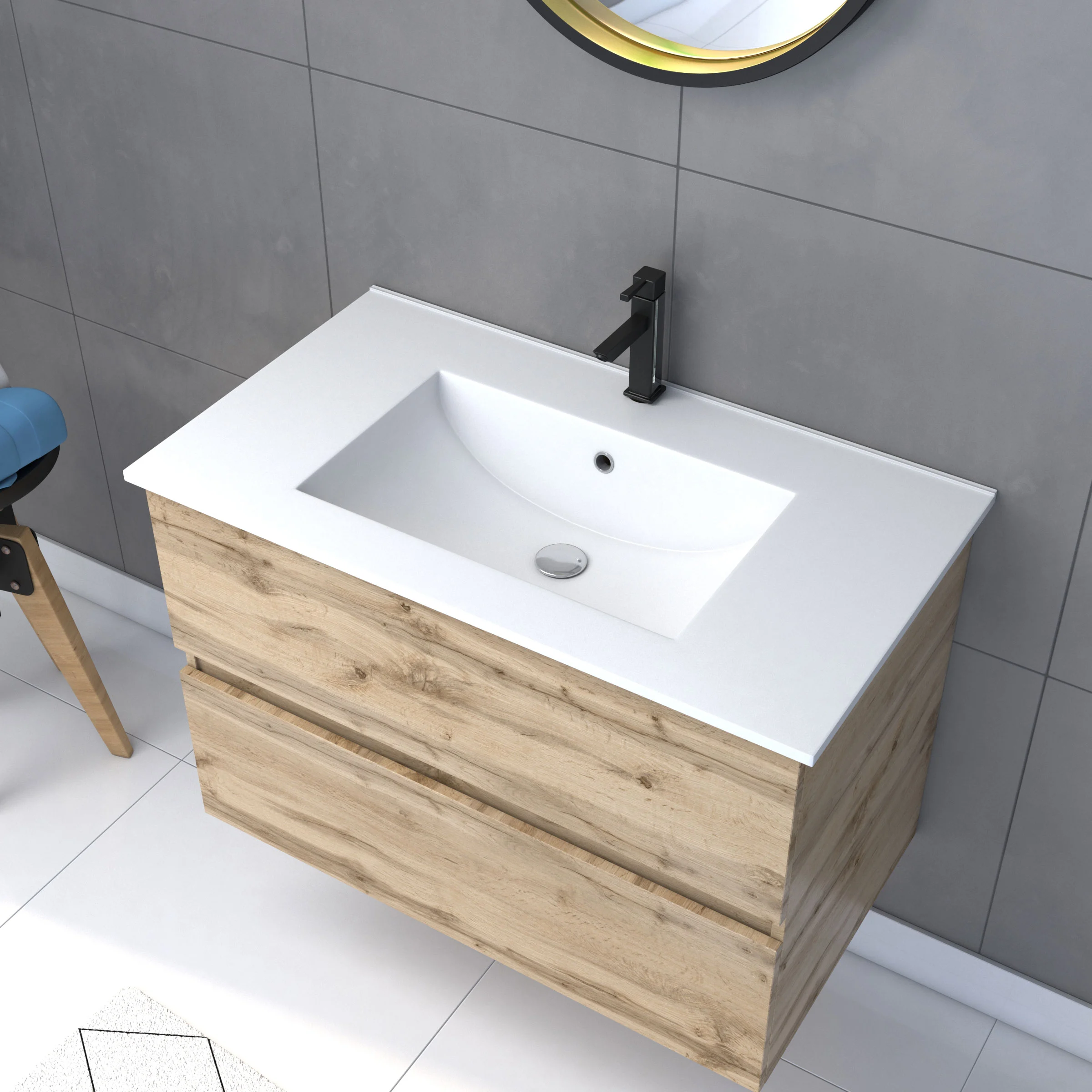 Meuble de salle de bains 80cm Chêne Clair 2 tiroirs avec Vasque céramique blanche - ONE