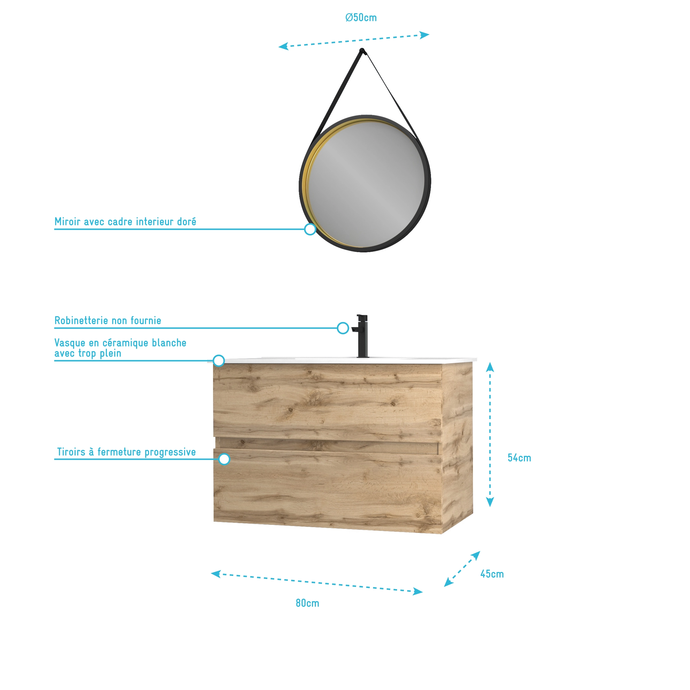 Pack Meuble SDB 80cm suspendu 2 tiroirs Chene_Vasque blanche + Miroir Barber – TIMBER 80 – Pack38