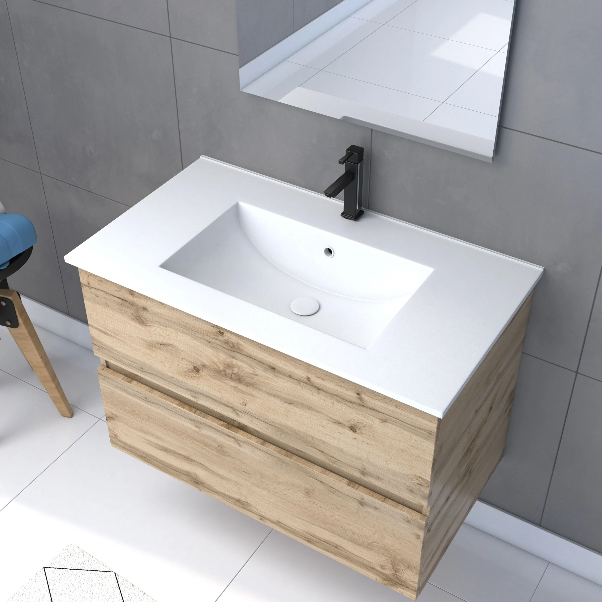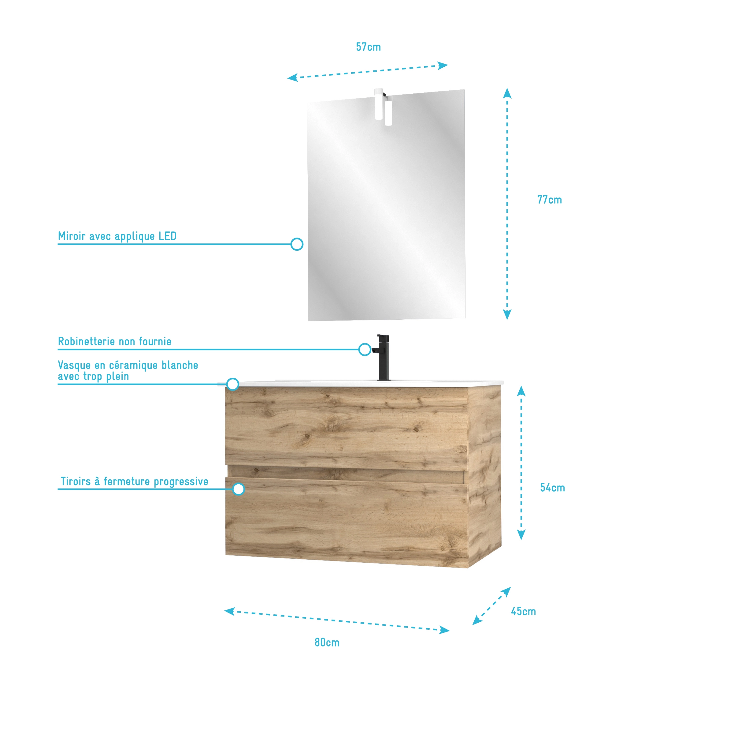 Pack Meuble SDB 80cm suspendu 2 tiroirs Chene_Vasque blanche + Miroir Led - TIMBER 80_Pack37