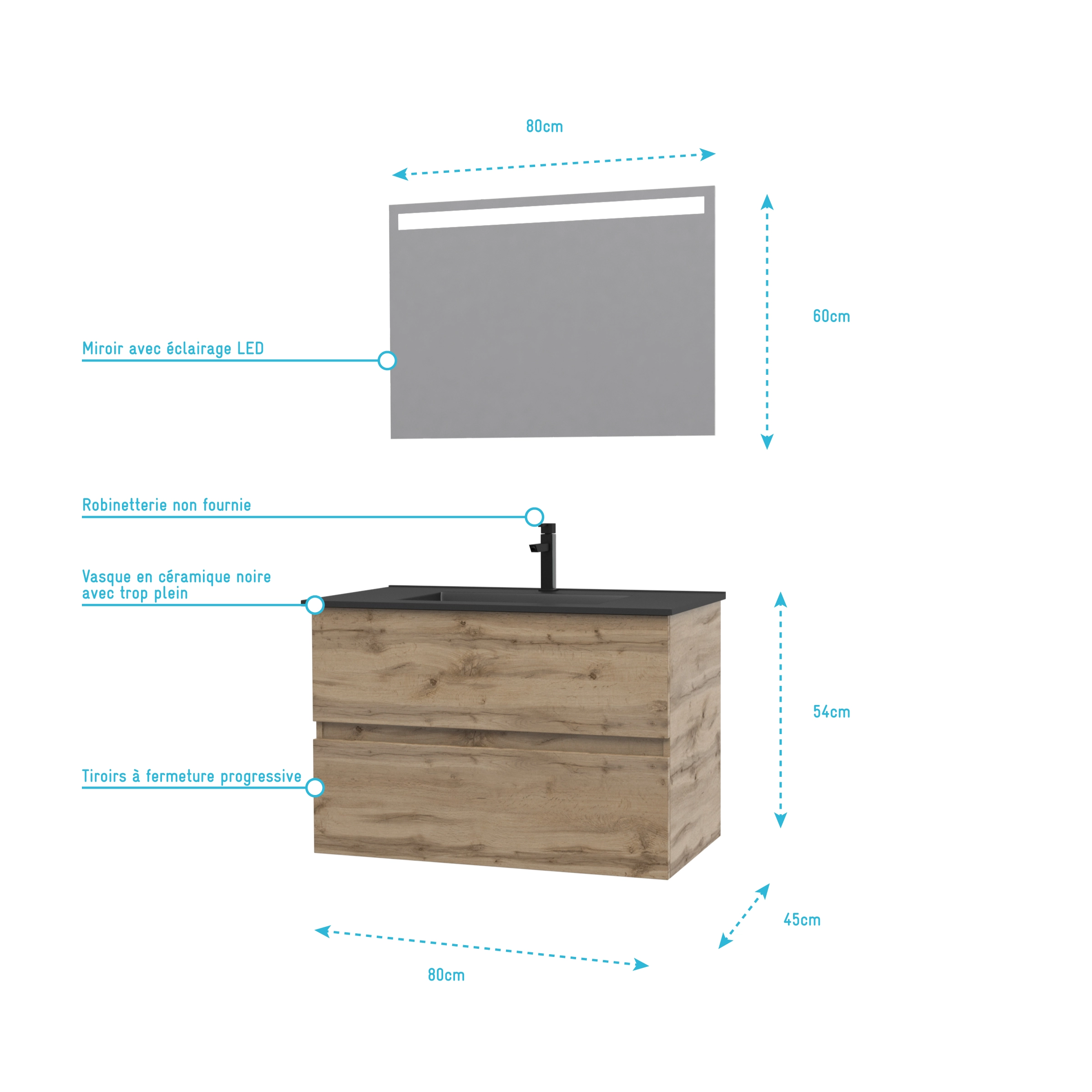 1 avis pour Meuble salle de bain 80×54 – Finition chene naturel + vasque noire + miroir Led – TIMBER 80 – Pack12