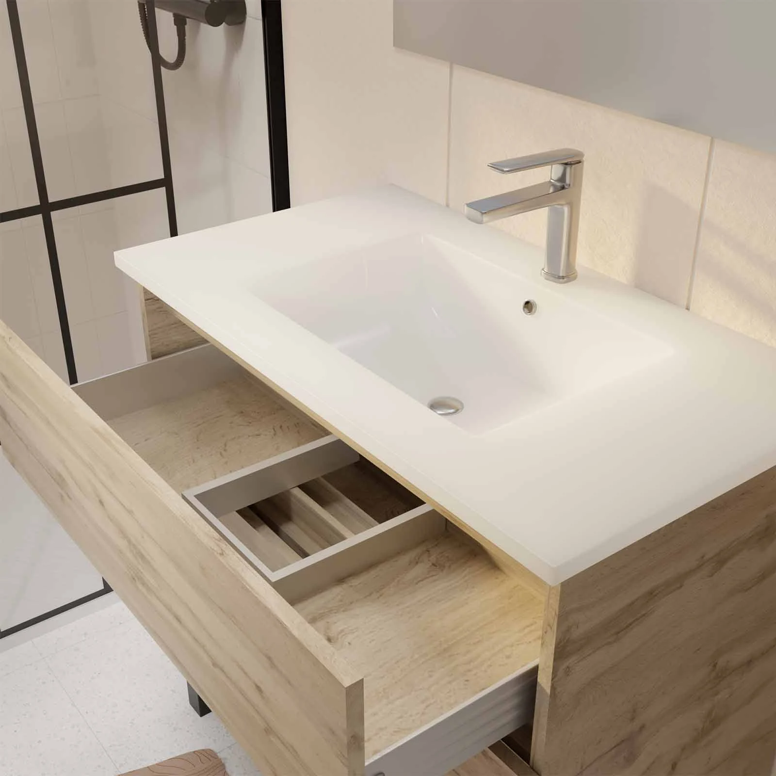 2 avis pour Pack Meuble SDB 80cm sur pieds 3 tiroirs Chene_Vasque blanche + Miroir Led – TIMBER 80_Pack46