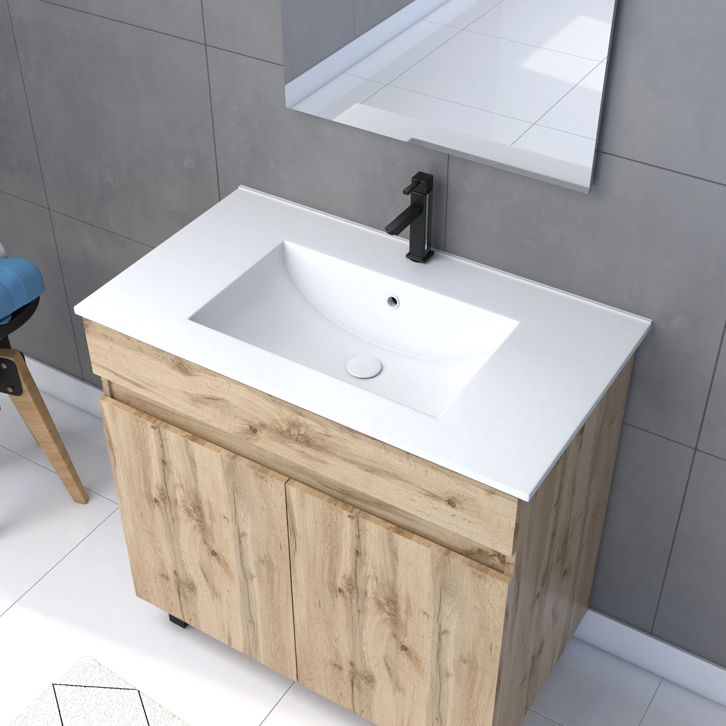 1 avis pour Meuble salle de bain 80×80 -Finition chene naturel + vasque blanche + miroir Led- TIMBER 80 – Pack27