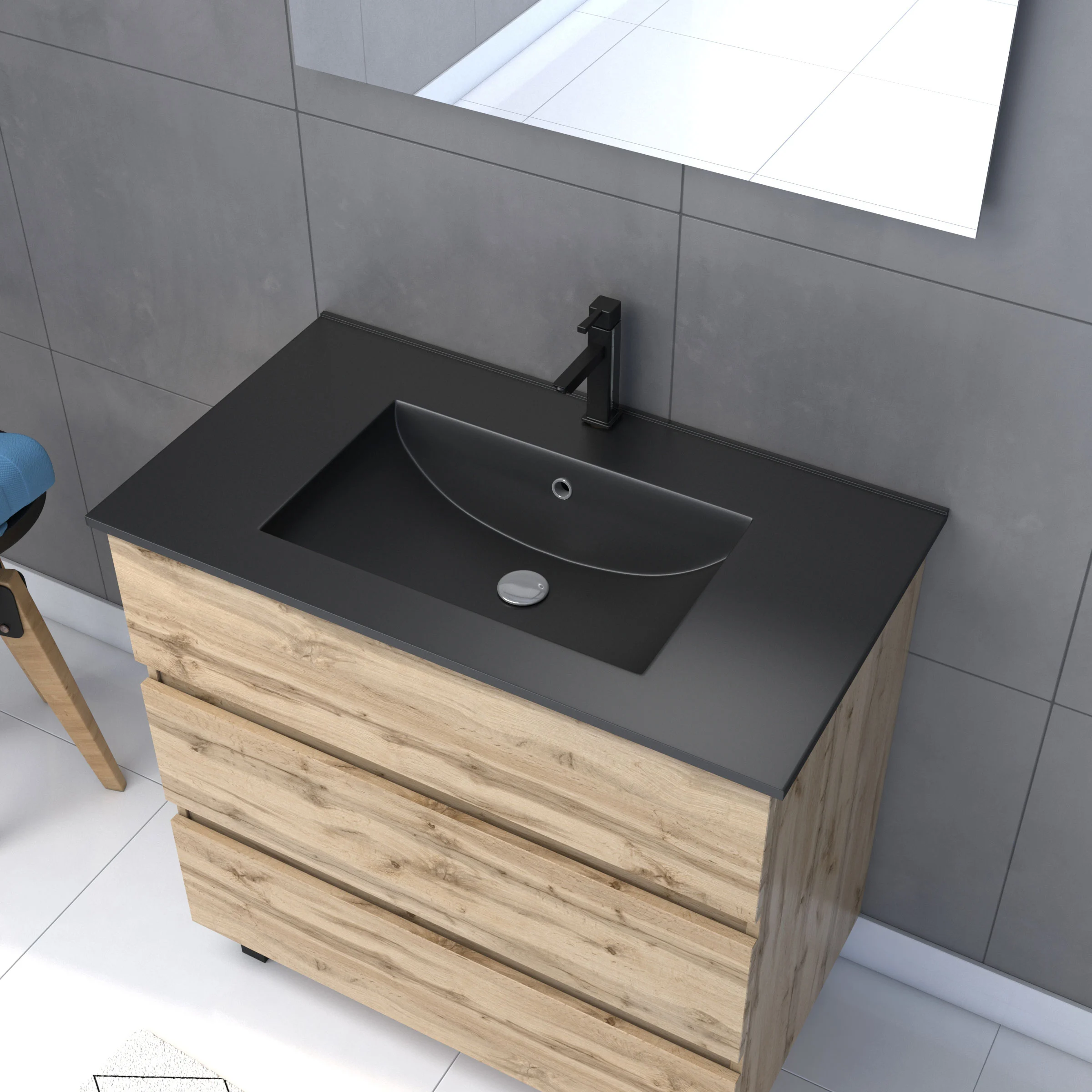 1 avis pour Meuble salle de bains 80cm décor chene naturel 3 tiroirs – Vasque noire et Miroir Led – TIMBER