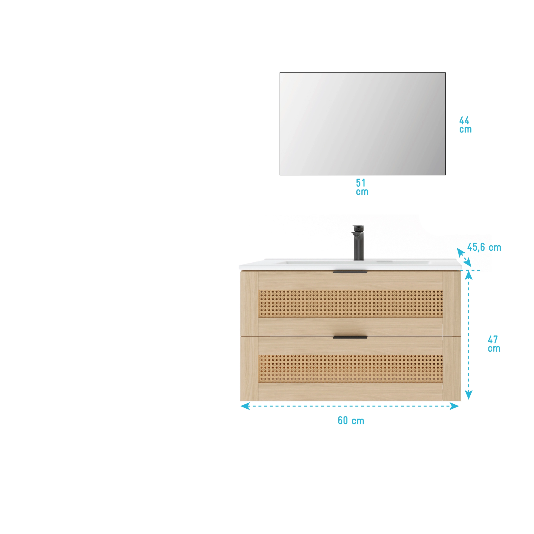 Meuble salle de bain cannage Apolline 60cm décor bois et cannage – 2 tiroirs, vasque et miroir