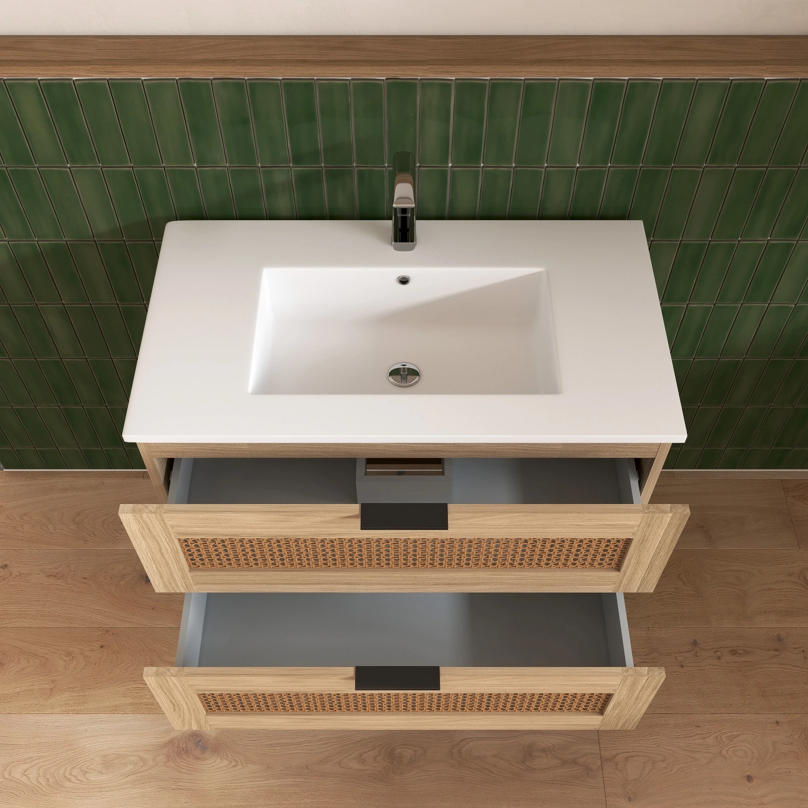 Meuble salle de bain cannage Apolline 80cm décor bois et cannage – 2 tiroirs, vasque et miroir