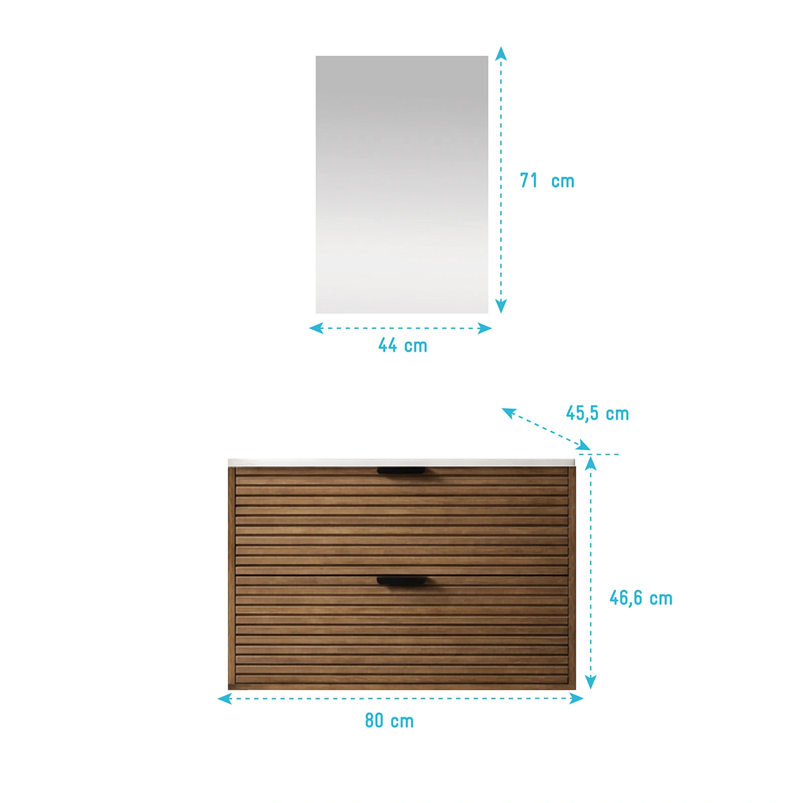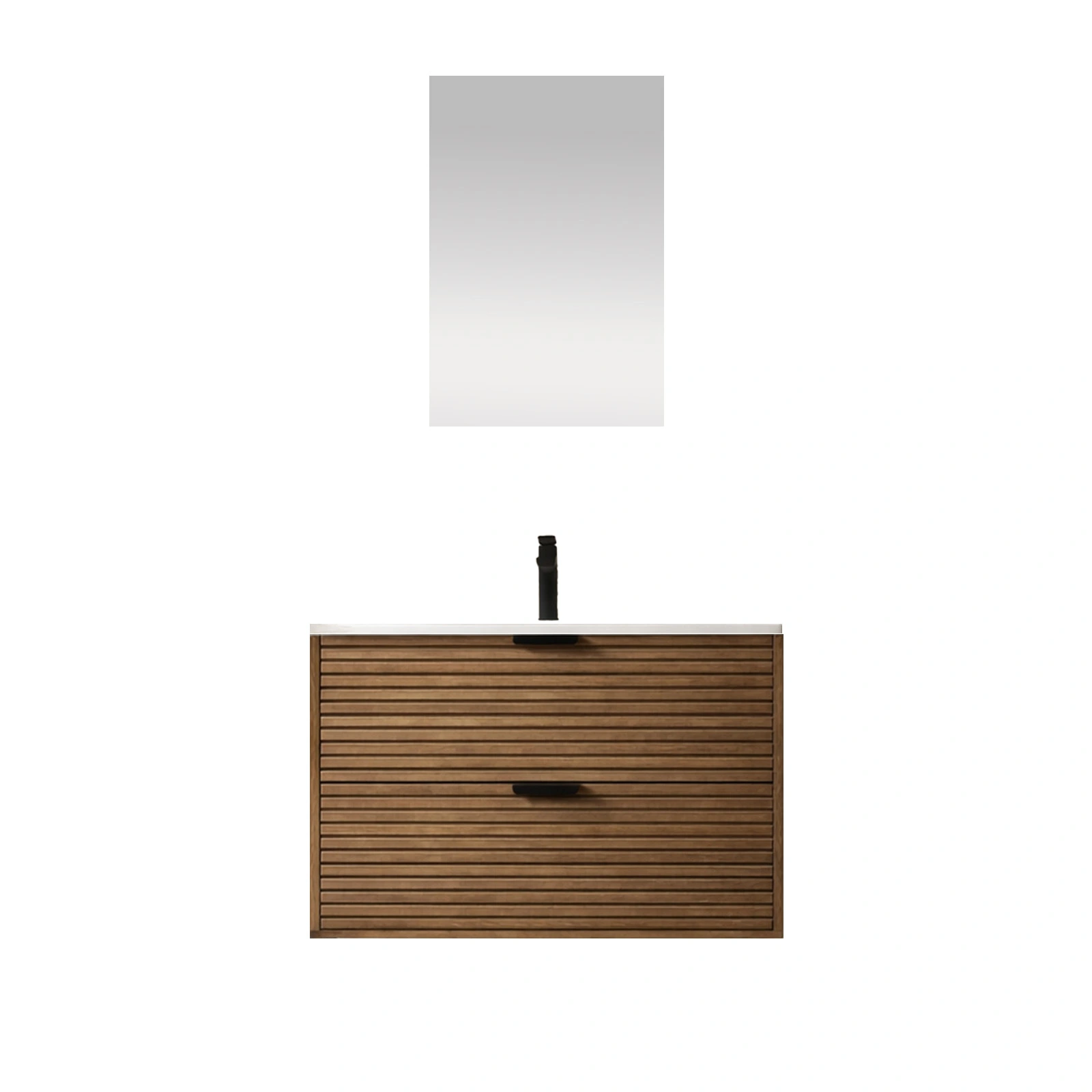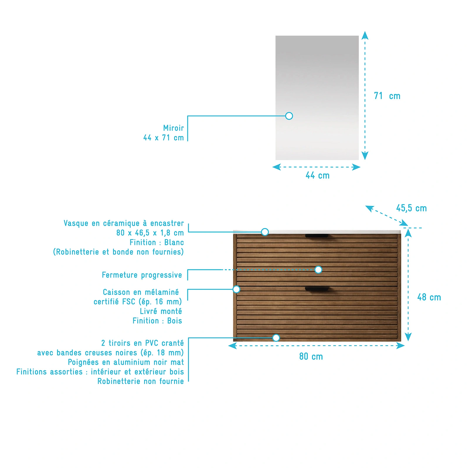Avec ses façades de tiroir crantées qui donnent du relief, cet ensemble meuble vasque et miroir modernise votre salle de bain.