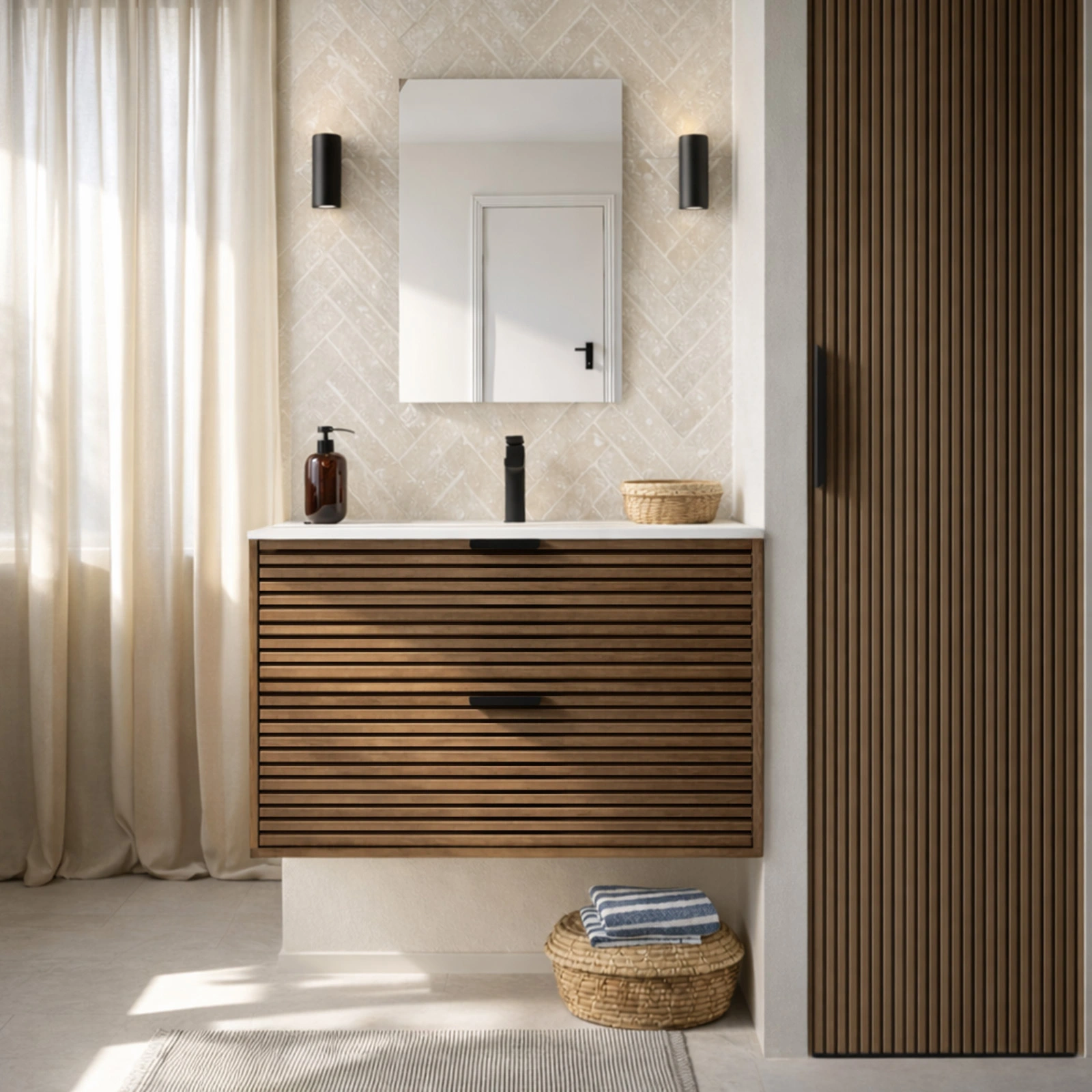 Le miroir assorti crée une belle harmonie visuelle et accentue la sensation d’espace.