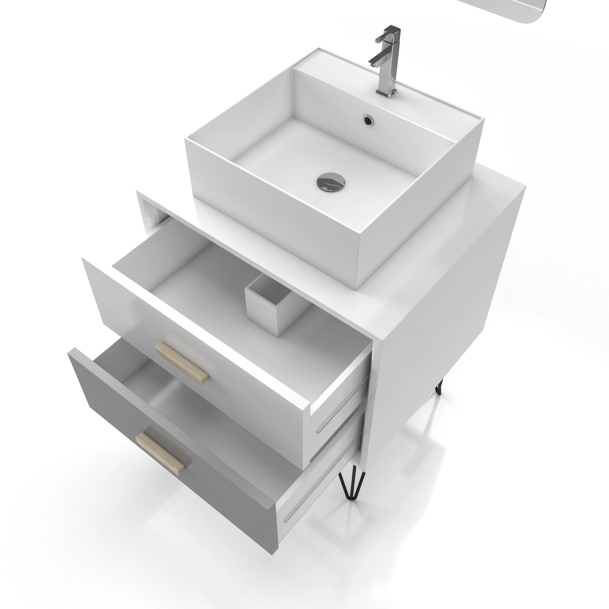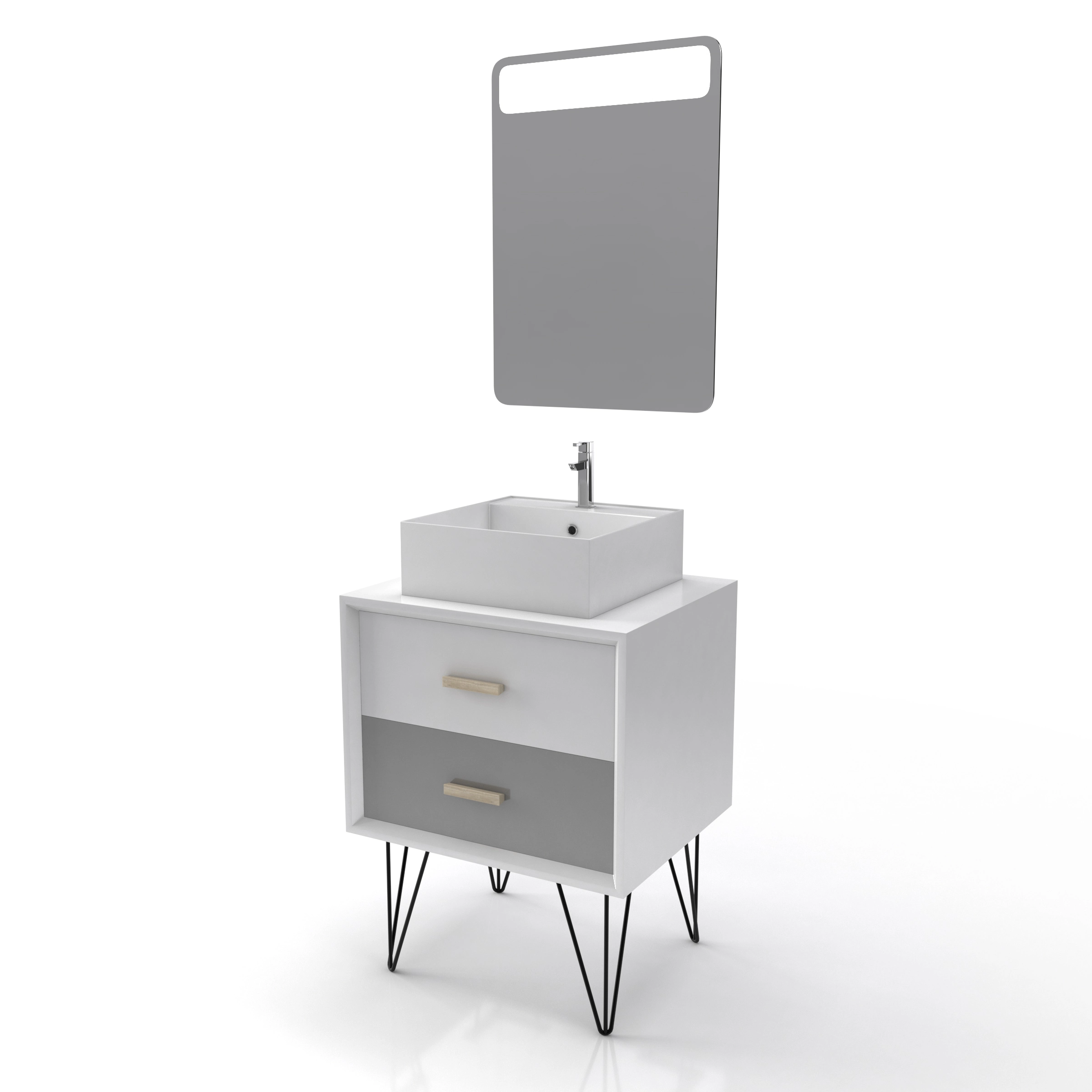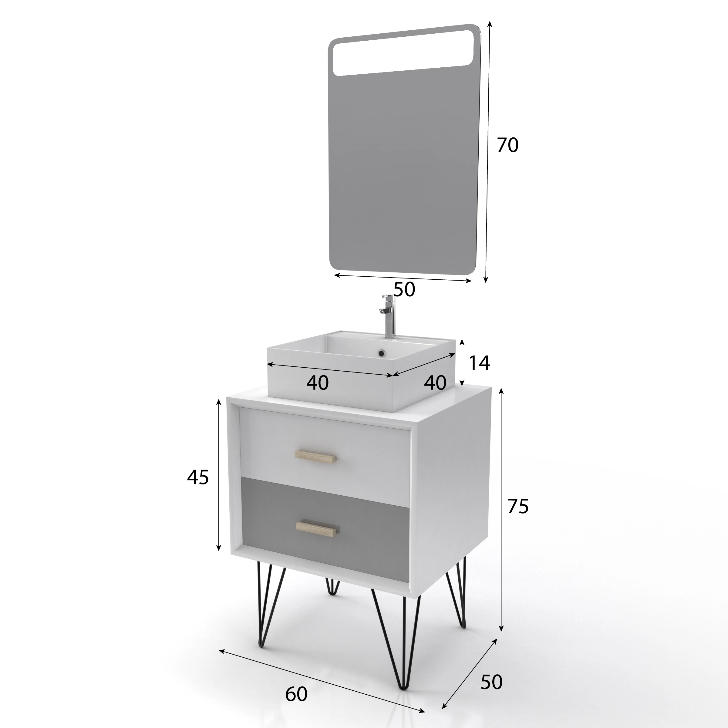 MEUBLE SALLE DE BAIN SCANDINAVE BLANC ET GRIS 60 CM SUR PIEDS AVEC TIROIRS, VASQUE A POSER ET MIROIR
