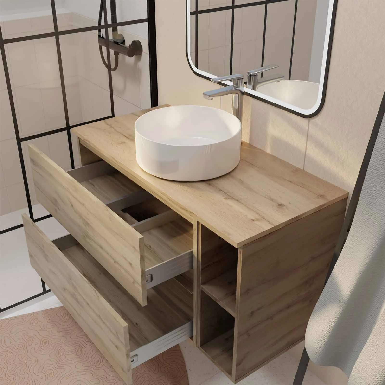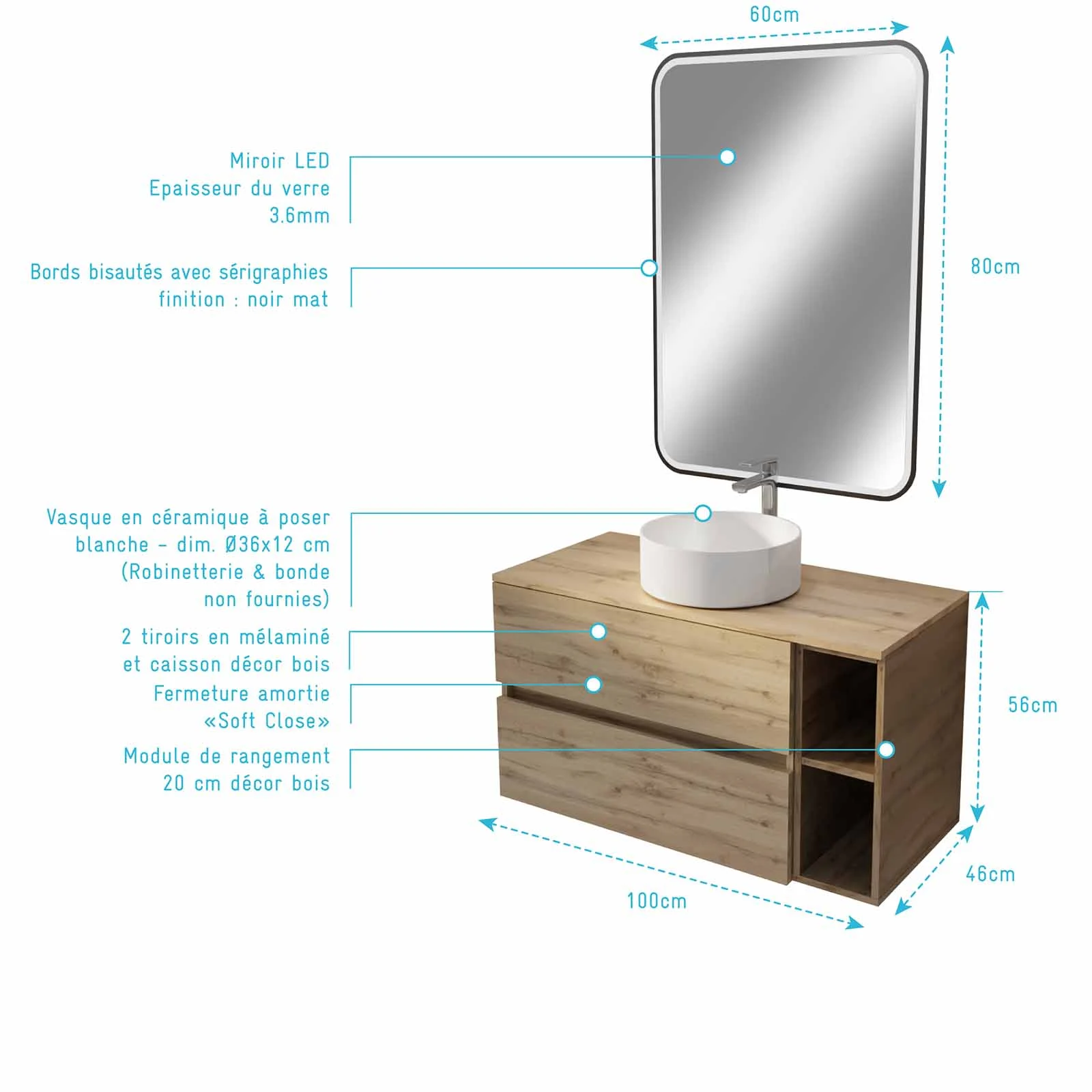 Son plan de toilette de 100 cm vient sublimer l’ensemble et assurer une harmonie parfaite entre les éléments. Une vasque à poser en céramique blanche et un miroir avec éclairage LED 4W à bords dépolis biseautés et sérigraphiés noir mat complètent l’ensemble pour un effet déco affirmé, où le bois chaleureux contraste subtilement avec une touche sombre.