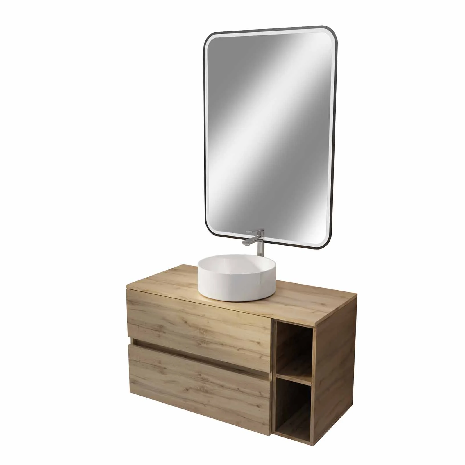 0 avis TIMBER Meuble salle de bains 100 TIMBER Décor Chêne 2 Tiroirs, Vasque Blanche, Miroir 60x80 LED bord Noir