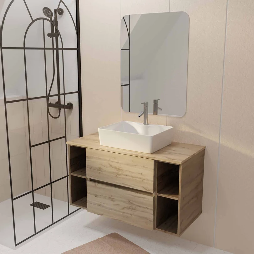 Meuble salle de bains 100 TIMBER Décor Chêne 2 Tiroirs Vasque Blanche Rectangulaire Miroir 60×80