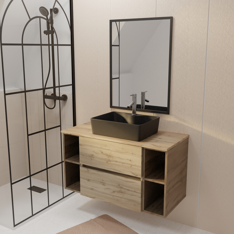 Meuble salle de bains 100 TIMBER Décor Chêne 2 Tiroirs Vasque Noire Rectangulaire Miroir 60×80