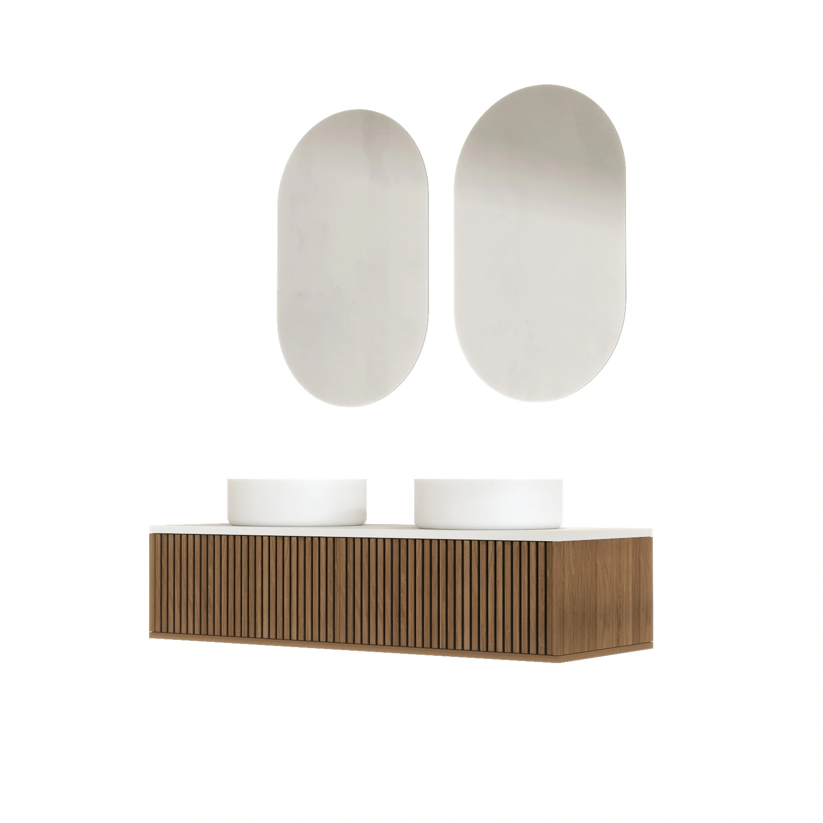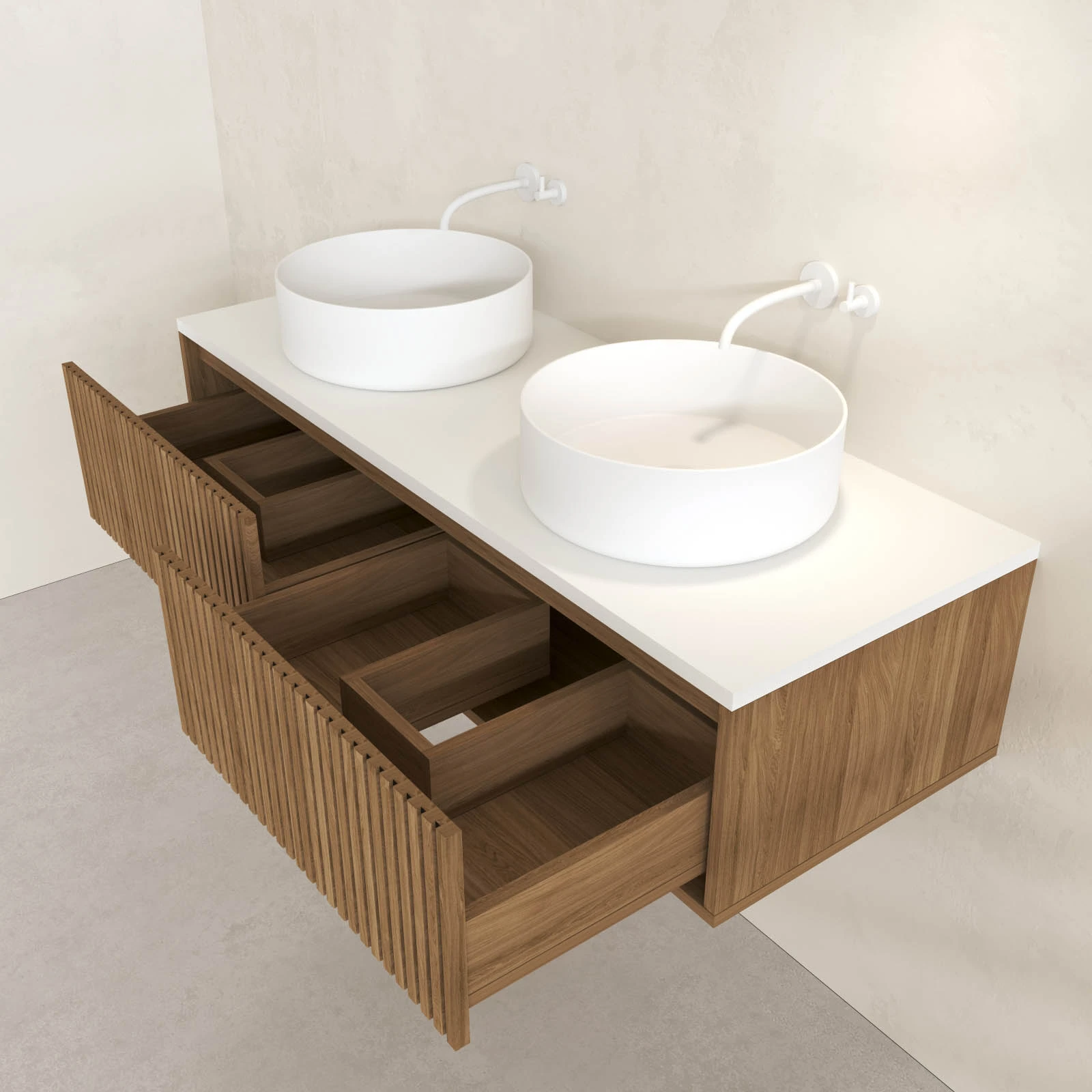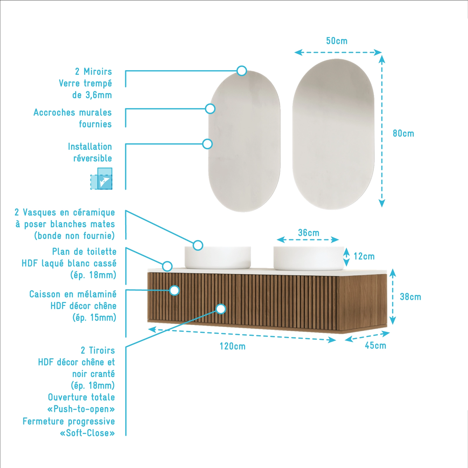 Plongez dans l’univers Japandi avec cette composition. Alliance subtile du raffinement japonais et de la douceur scandinave. Sa façade crantée bicolore bois et noir profond joue sur les reliefs pour apporter une forte présence déco à votre salle de bains, tout en conservant une esthétique épurée.