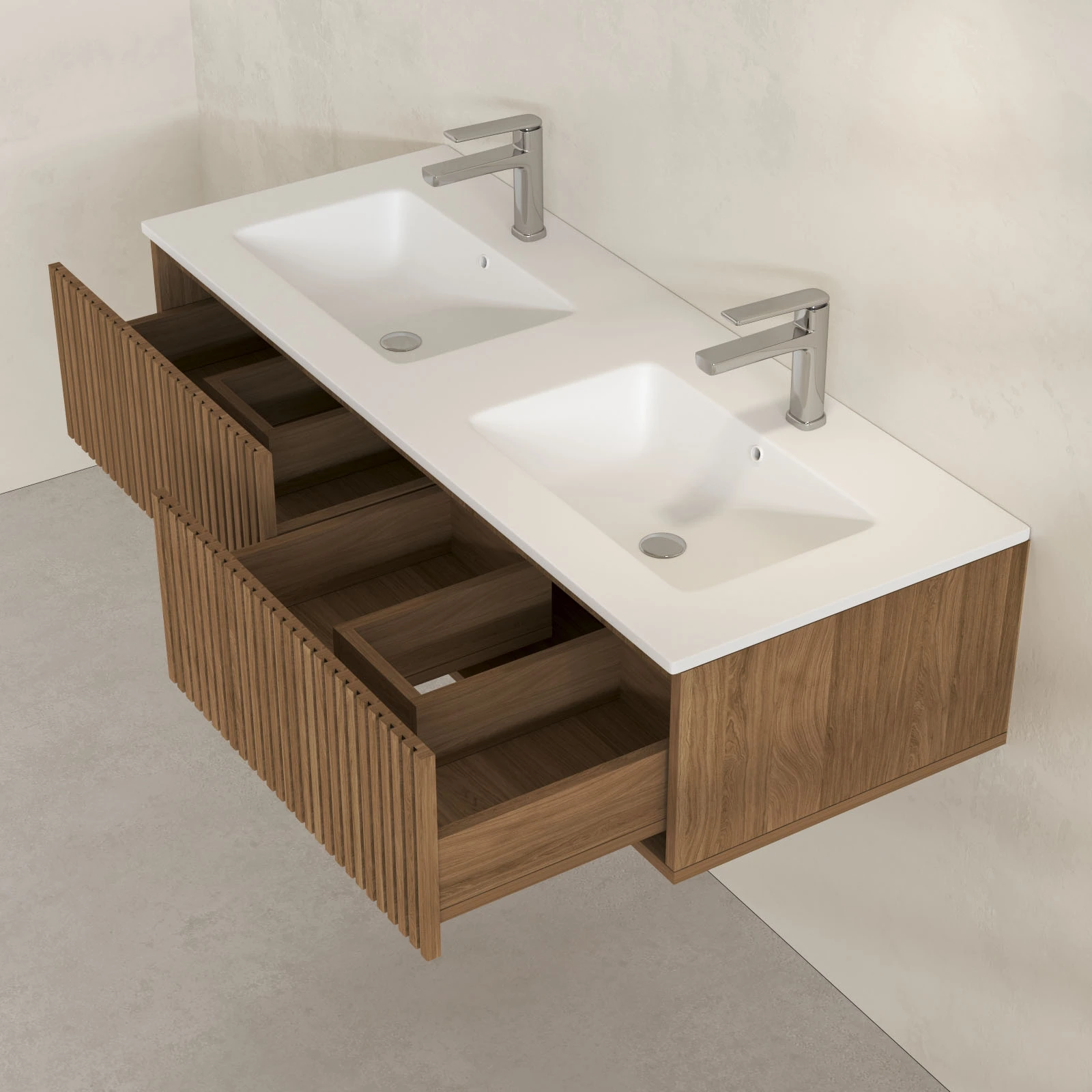 La vasque encastrée blanche mate donne une silhouette encore plus épurée et contemporaine au meuble.