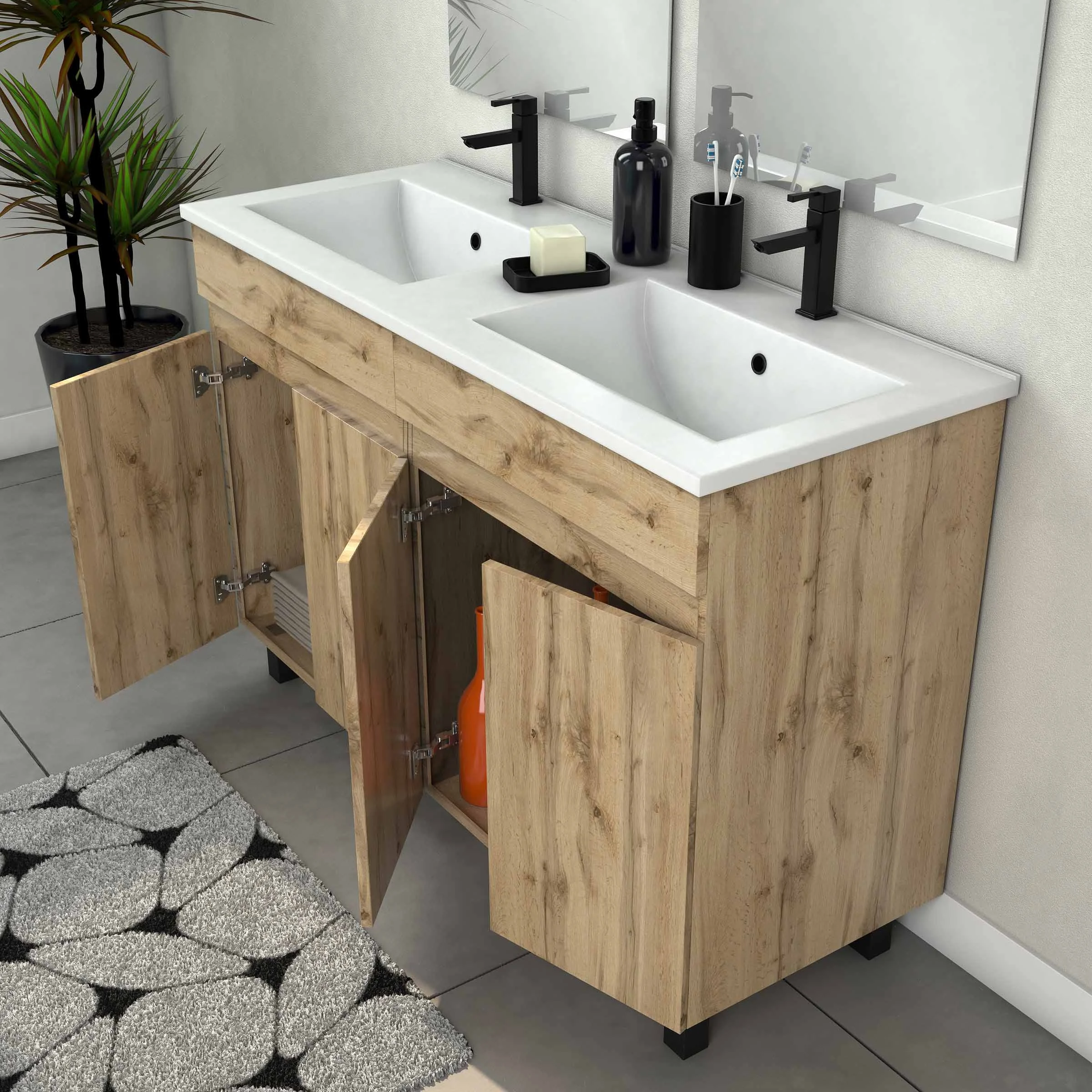1 avis TIMBER Meuble Salle de Bains 120cm 4 Tiroirs Chêne Naturel - 2 Vasques Blanches Effet Marbre 38x38x13cm