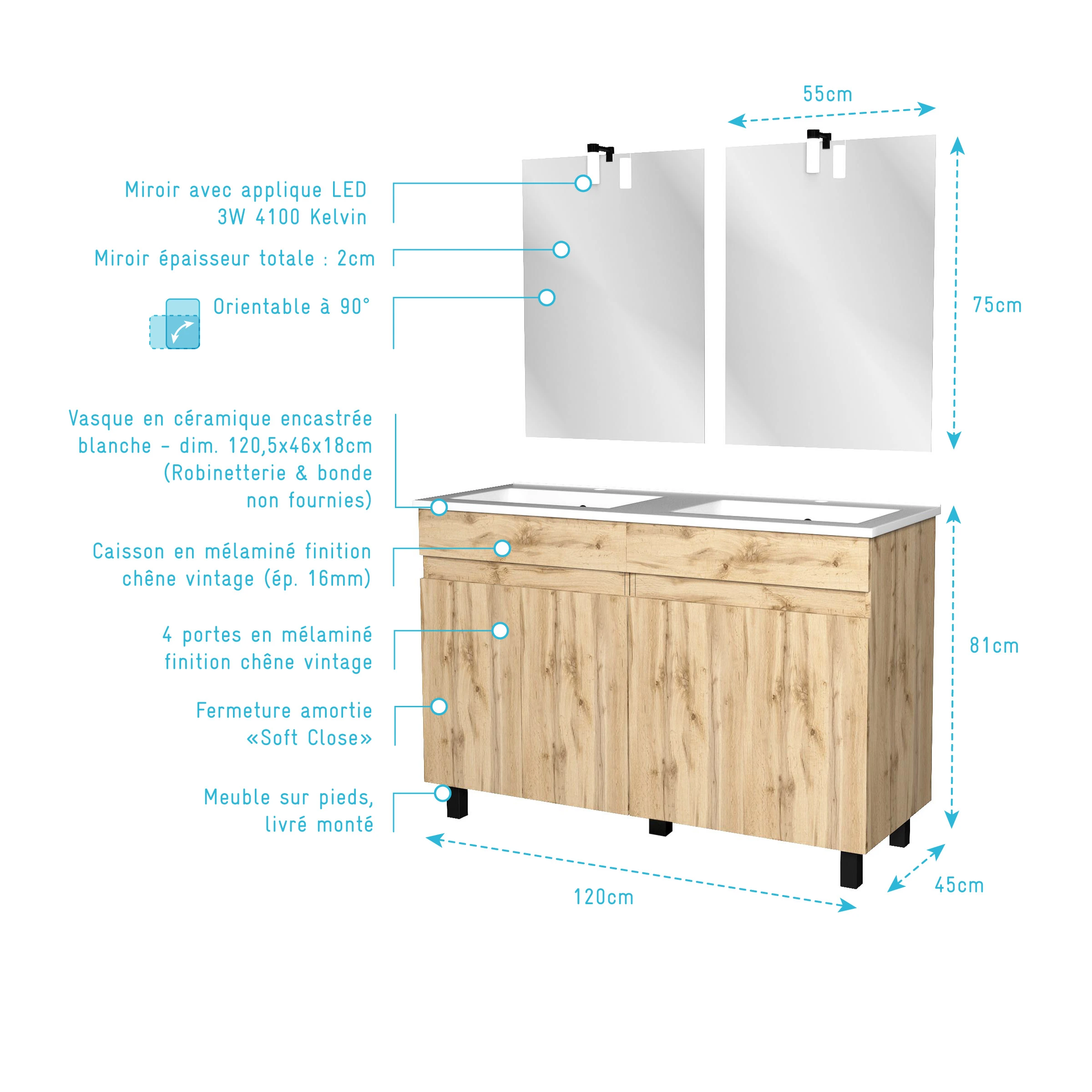 Meuble Salle de Bains 120cm 4 Portes Chêne Naturel + Vasque Blanche et Miroirs avec appliques Led