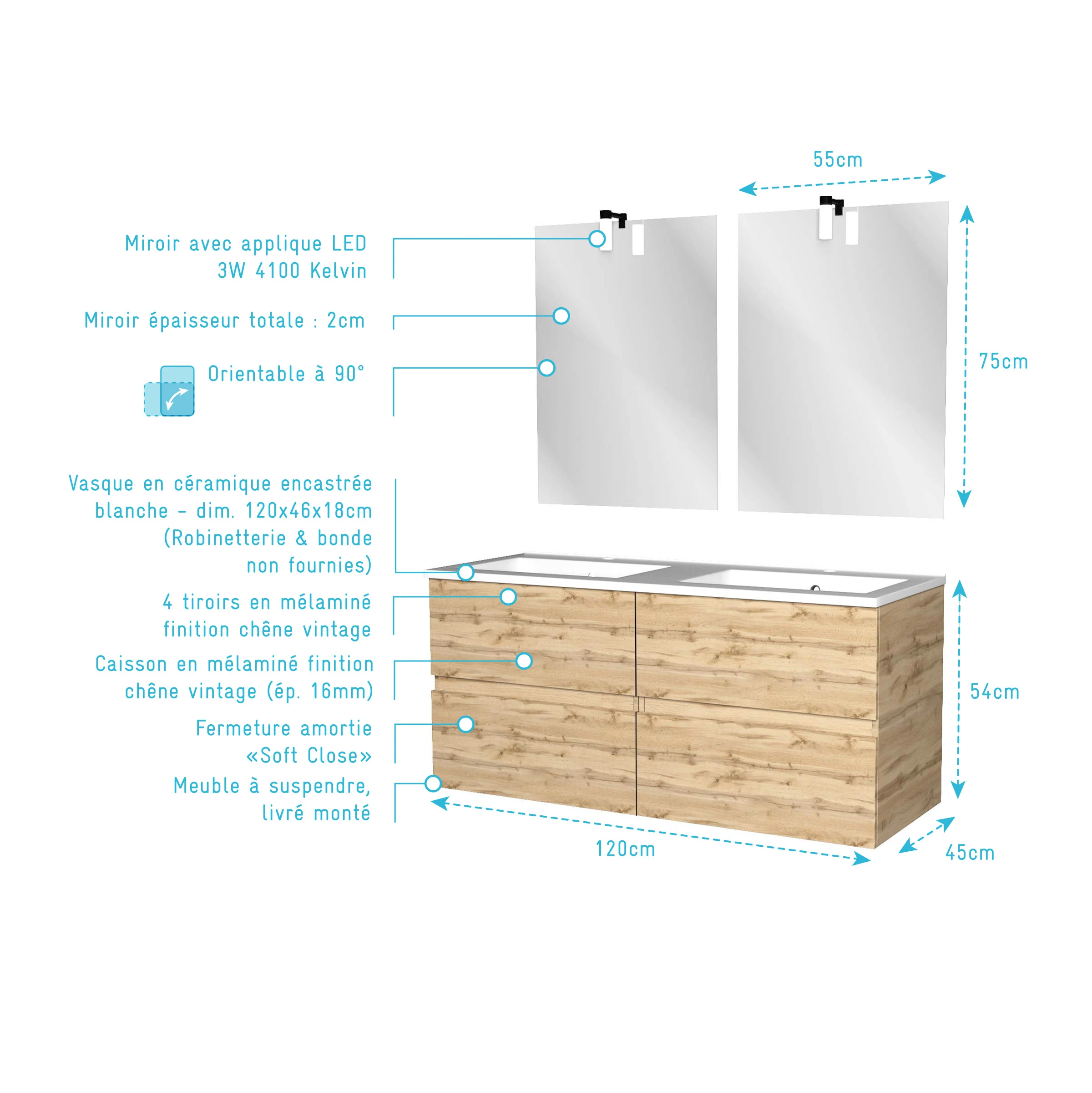 Meuble Salle de Bains 120cm 4 Tiroirs Chêne Naturel + Vasque Blanche + Miroirs avec appliques Led