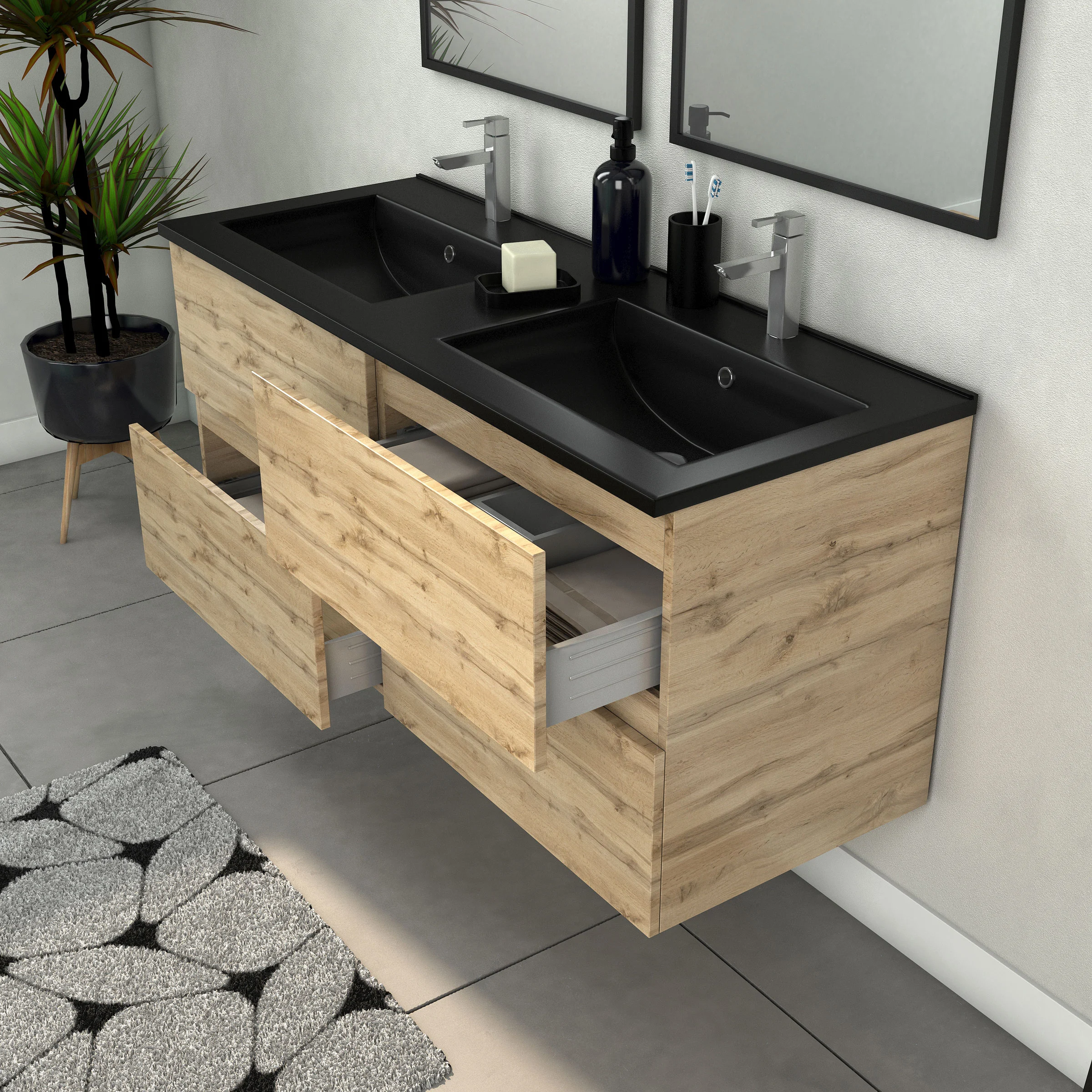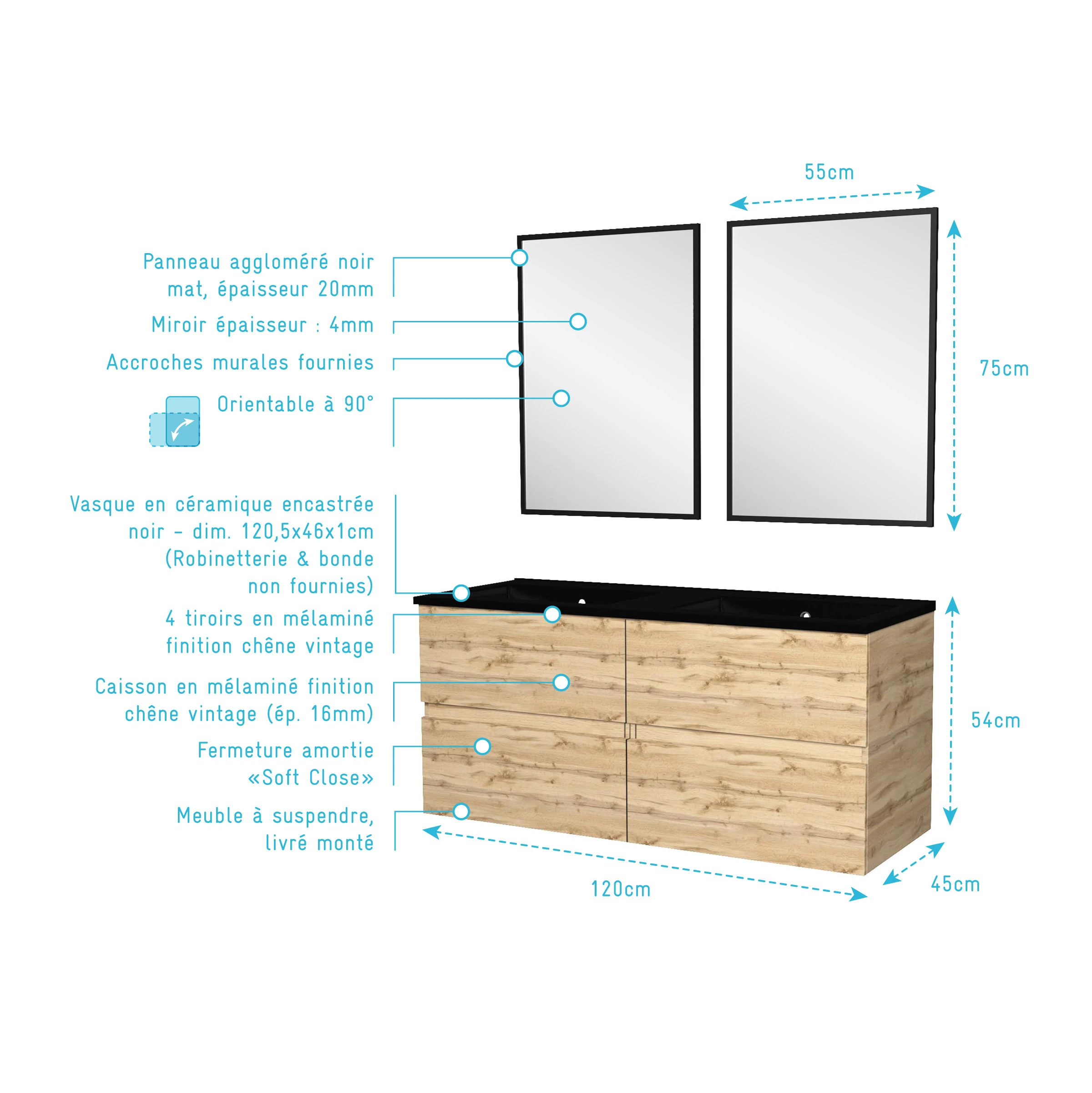 Meuble Salle de Bains 120cm 4 Tiroirs Chêne Naturel + Vasque Noire et Miroirs rectangulaires