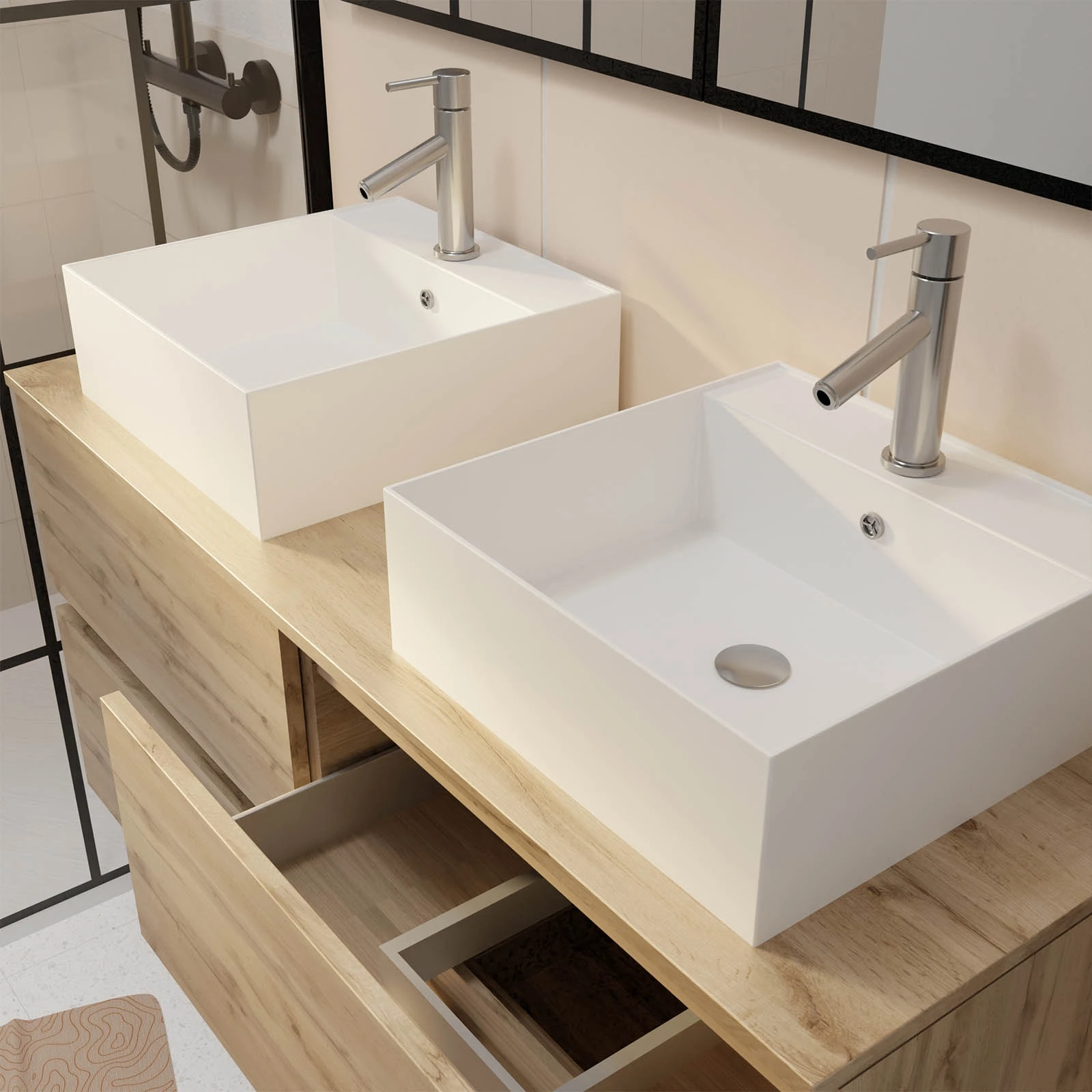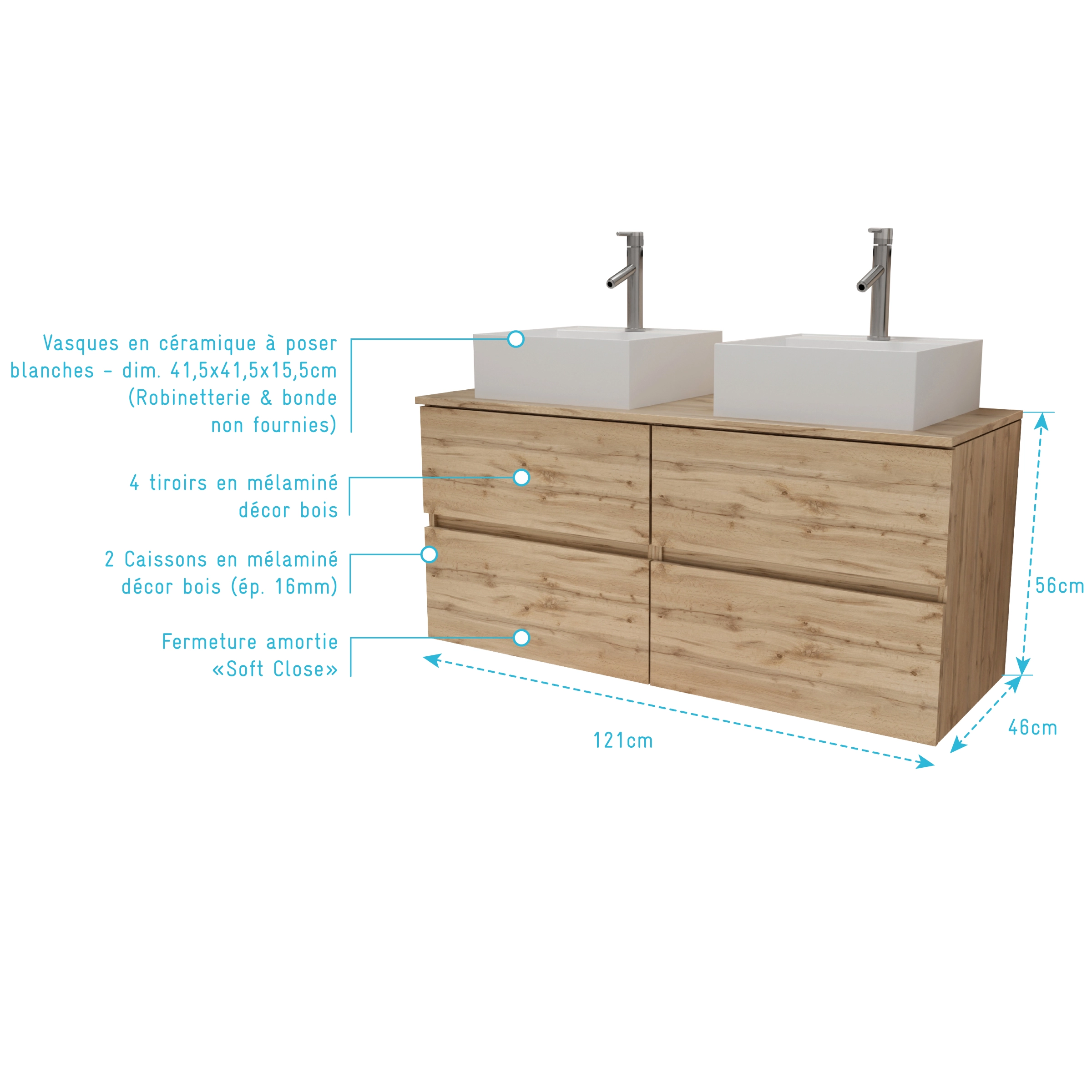 0 avis TIMBER Meuble Salle de Bains 120cm 4 Tiroirs Chêne Naturel - 2 Vasques Carrées 41x41x15cm Blanches