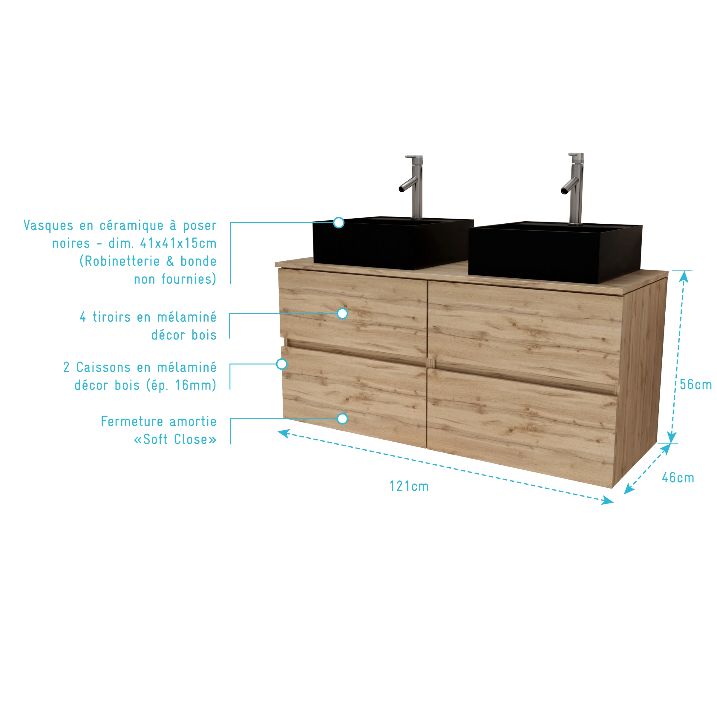 Meuble Salle de Bains 120cm 4 Tiroirs Chêne Naturel – 2 Vasques Carrées 41x41x15cm Noires