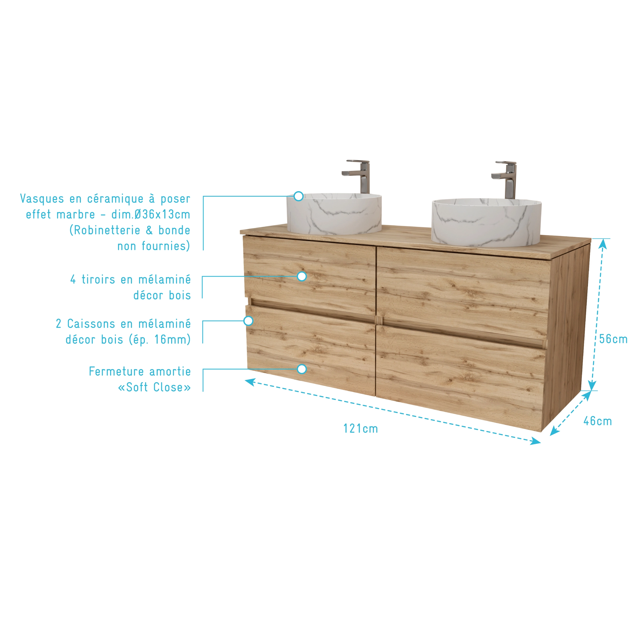Meuble Salle de Bains 120cm 4 Tiroirs Chêne Naturel – 2 Vasques Rondes 36cm Blanches Effet Marbre
