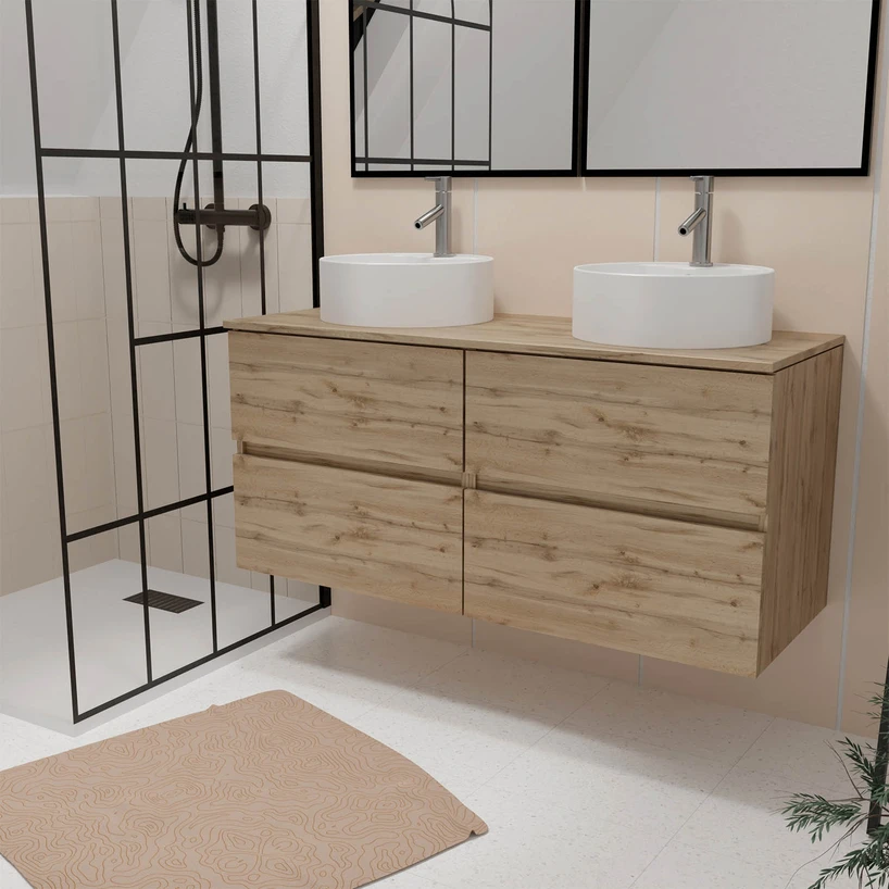 Meuble Salle de Bains 120cm 4 Tiroirs Chêne Naturel – 2 Vasques Rondes 41cm en Céramique Blanche