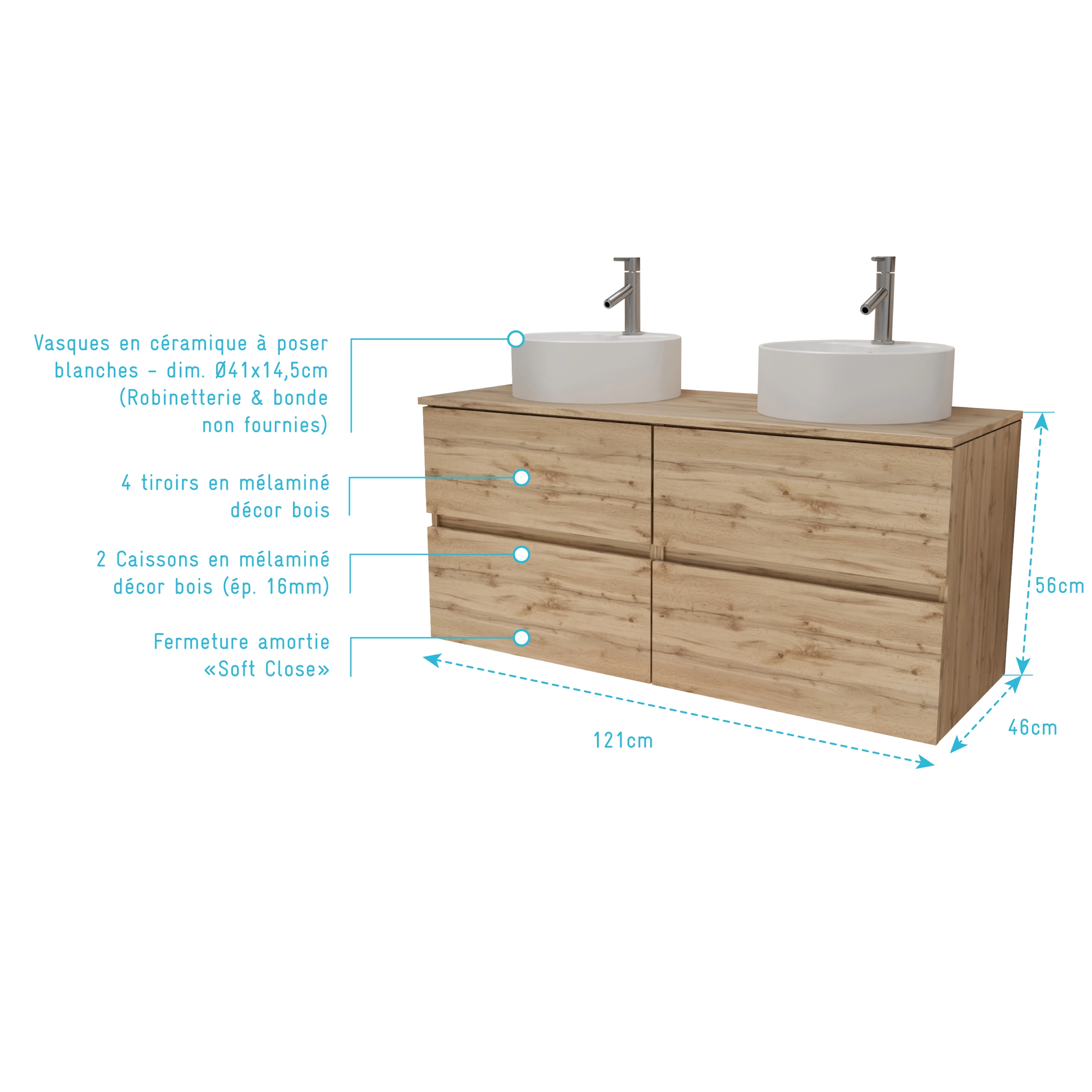 2 avis pour Meuble Salle de Bains 120cm 4 Tiroirs Chêne Naturel – 2 Vasques Rondes 41cm en Céramique Blanche