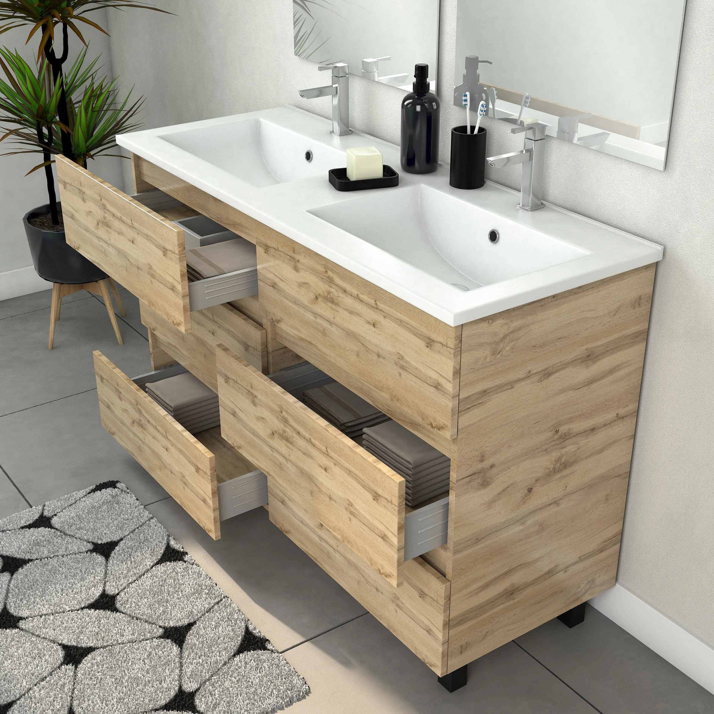Meuble Salle de Bains 120cm 6 Tiroirs Chêne Naturel + Vasque Blanche + Miroirs avec appliques Led