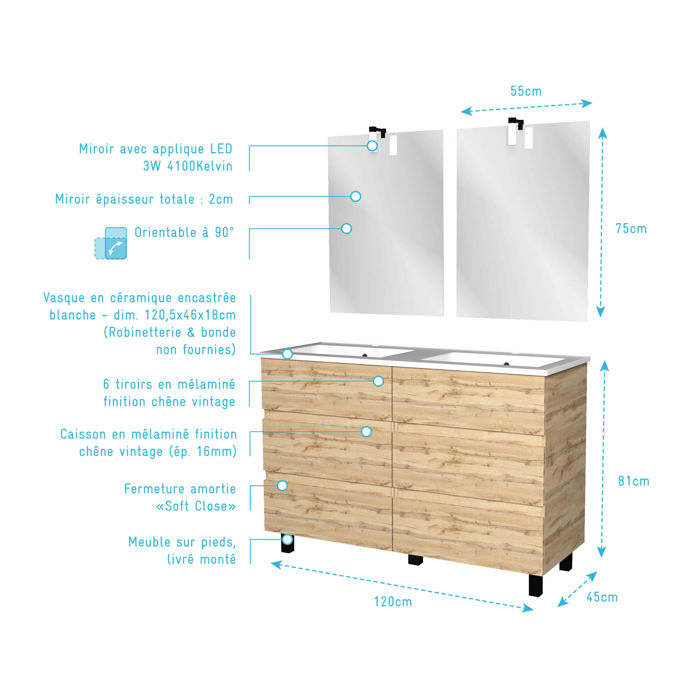 Ensemble meuble de salle de bains 120 cm 6 tiroirs, avec une double vasque en céramique blanche et deux miroirs avec appliques Led.