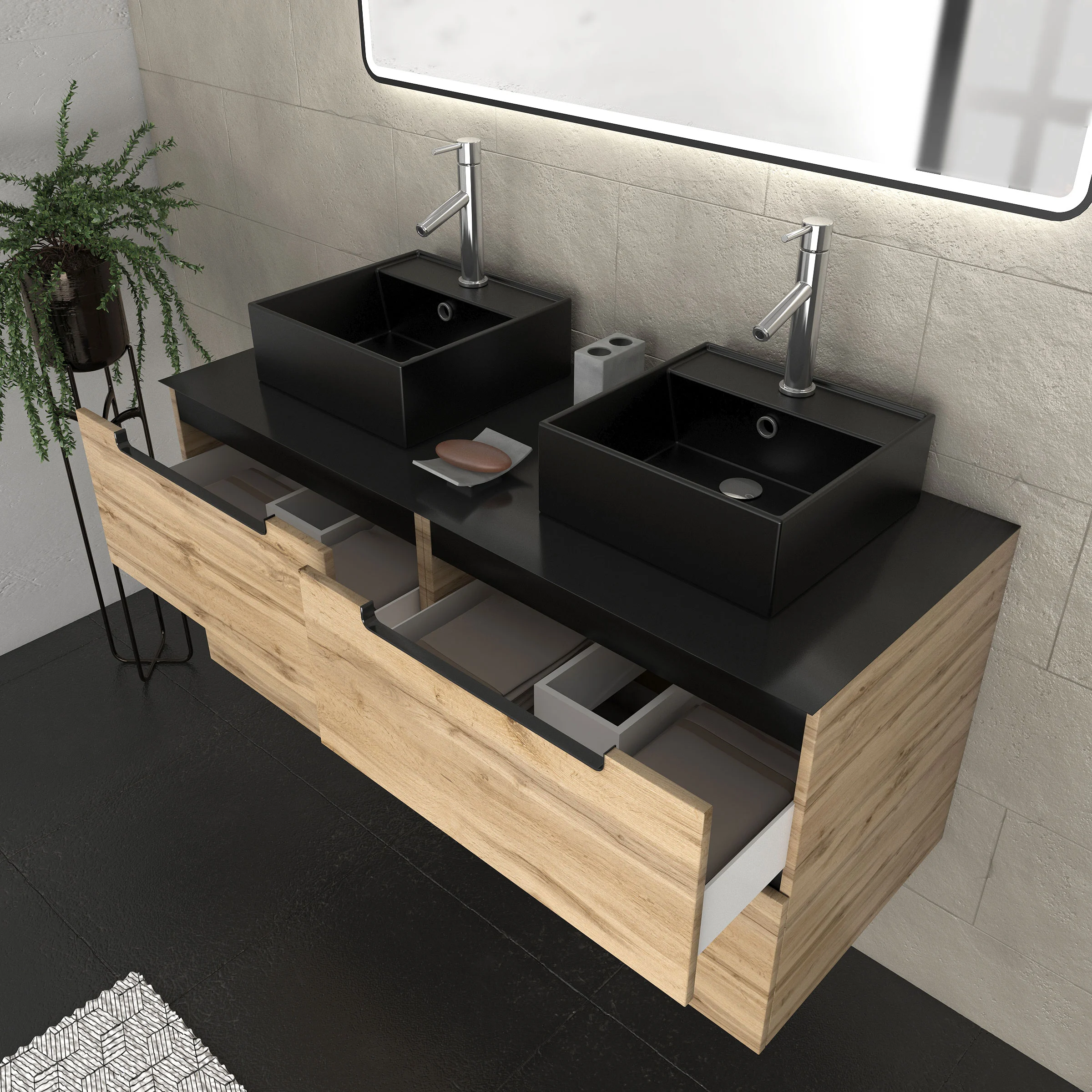 0 avis TIMBER Meuble Salle de Bains 120cm 4 Tiroirs Chêne Naturel, 2 Vasques Noires 41x41x15cm, 2 Miroirs 55x75cm