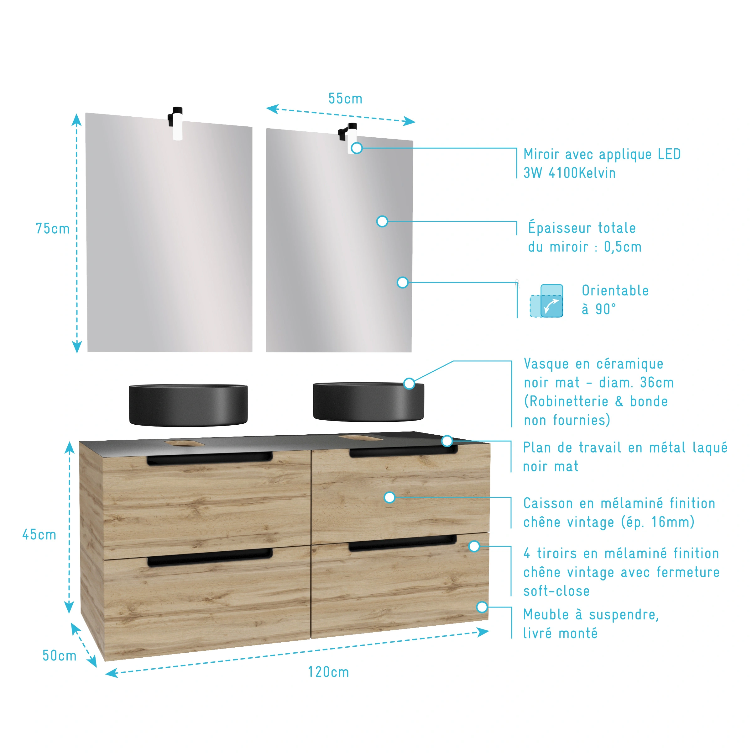 Meuble salle de bains 120cm Chene et noir, Vasques rondes Diam 36 et Miroirs avec appliques 55×75