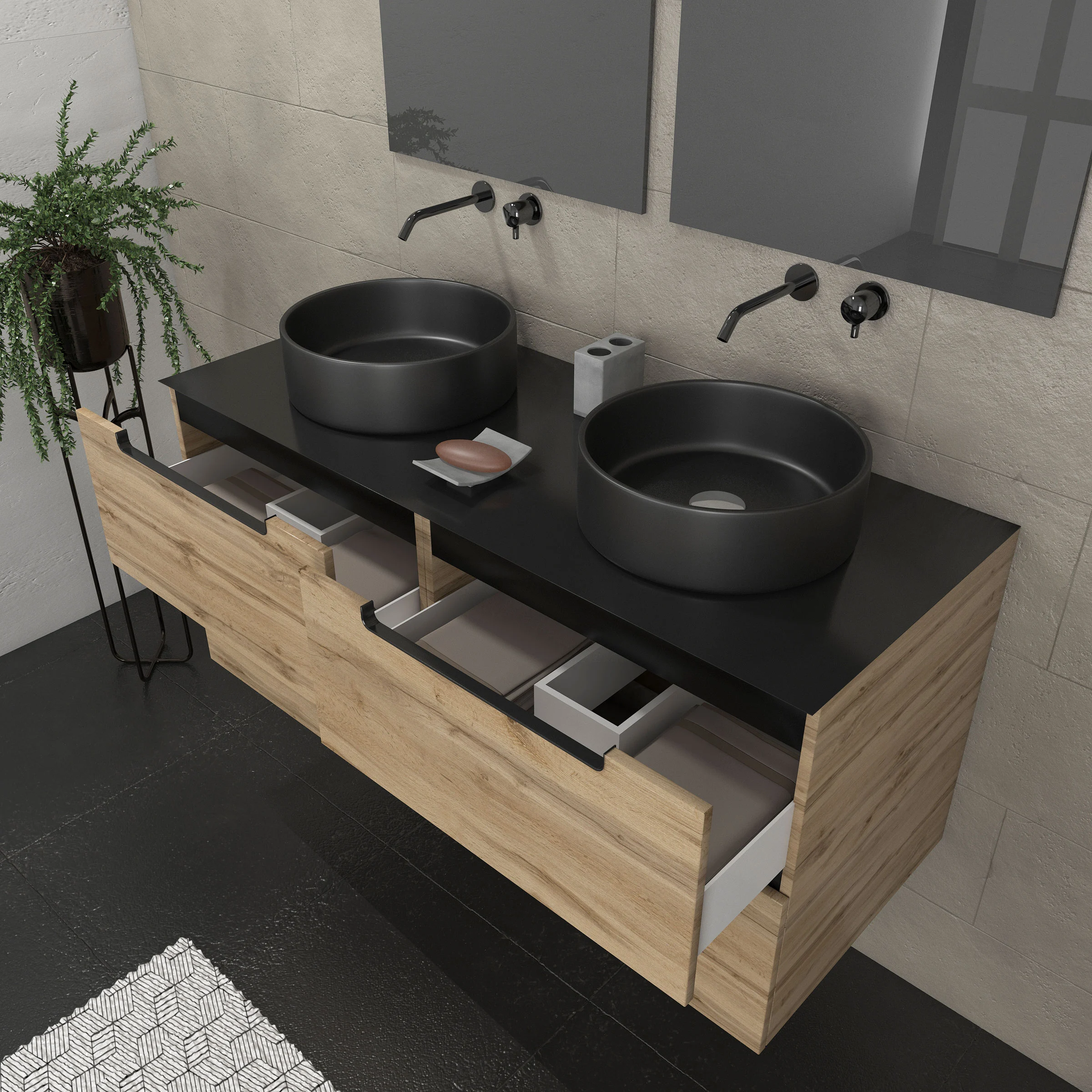 0 avis TIMBER Meuble de salle de bains 120 cm TIMBER - Décor Chêne, 2 tiroirs, Vasque noire à poser