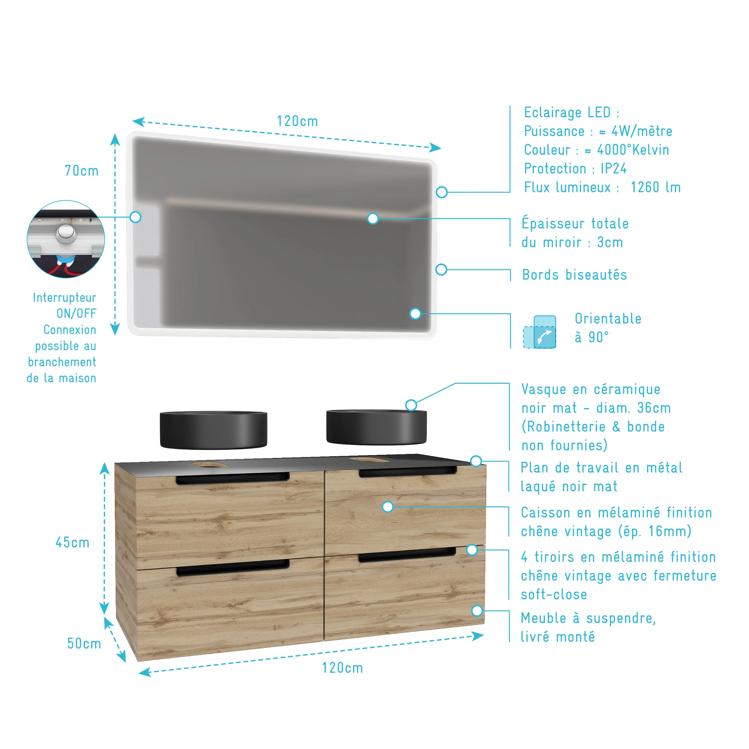 Meuble salle de bains 120cm Chene et noir, Vasques rondes Diam 36cm et Miroir Led 120×70 – OMEGA