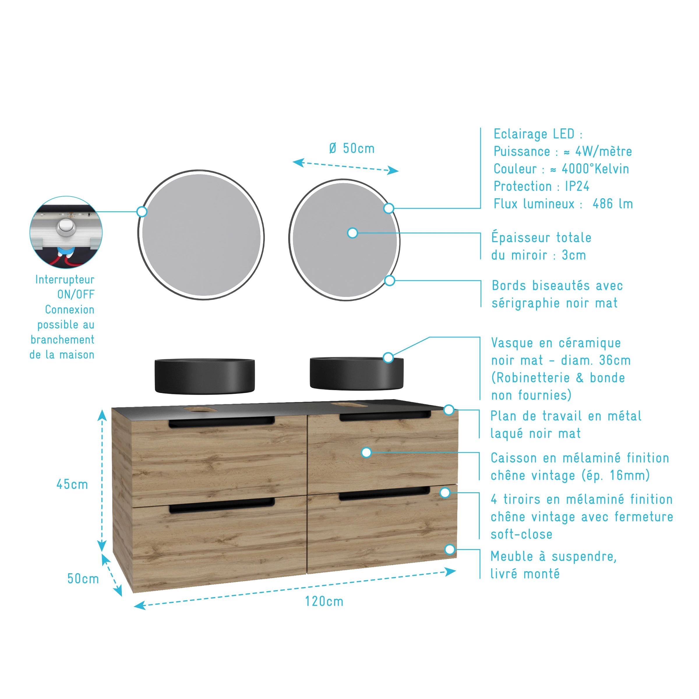 Meuble salle de bains 120cm Chene et noir, Vasques rondes Diam 36cm et Miroirs Black Led Diam 50cm
